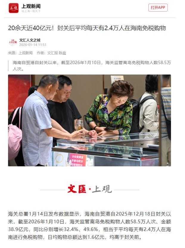 20余天消费近40亿元! 海南封关后平均每天有2.4万人在海南免税购物,海关总署刚公布的这组数据,真是直观地让人感受到海南封关后的消费热度有多高。 具体来说,从2025年12月18日封关到2026年1月10日,短短20多天里,去海南免税购物的有58.5万人次,花了38.9亿元,比去年同期分别多了32.4%和49.6%,平均每天2.4万人买,每天花1.6亿元,都比封关前多。 有人可能会问,为啥封关后海南免税这么火?说实话,这不是碰巧,是政策给的实惠、东西变多了、逛着也舒服了这几样凑到一起的结果,每一样都说到了大家心坎里。 最关键的还是封关带来的政策福利,都是实打实的好处。以前去海南免税店,能买的就几样,无非是化妆品、奢侈品这些。 现在不一样了,封关前一个多月,政策就提前升级了,免税商品从45大类加到了47大类,像宠物用品、小乐器、微型无人机、小家电这些以前买不到的,现在都能买了。 更重要的是,连衣服鞋子、陶瓷、丝巾、咖啡茶叶这些国内货,也能进免税店卖,还能退税费,选择一下子就多了。 享受福利的人也变多了,以前16岁就能买,现在调整到18岁,国外来的游客也能享受,每年还是10万元额度,不限次数。 海南本地人更划算,只要一年出过一次岛,买化妆品、衣服、箱包这15类东西就能不限次数,还能买了直接拿走,日常用着特别方便。 光政策好还不够,大家最关心的还是价格便宜不便宜。封关后最大的变化就是零关税的商品变多了,以前只有1900种,现在加到了6600种,占了所有商品的74%。进货成本低了,卖价自然就降下来了。 比如成都的陈小姐,在海口免税城买了个华为三折叠屏手机,官网卖19999元,免税价才16637元,再加上商场和银行的优惠,一下子省了近5000元,这便宜谁不心动? 还有徕卡相机,以前在海南买要交税,现在免税后,一款相机从7万多降到6万4,叠加优惠后更划算,没多久就卖断了三款。 不光大件便宜,日常用品也划算,进口奶粉、纸尿裤这些,比内地超市便宜10%-20%,本地人常年买能省不少钱。 现在去海南免税店逛,体验感也比以前好太多。以前去免税店,都是拿着清单直奔柜台,买完就走,特别赶。现在不一样了,免税店不只是卖东西的地方,还能玩、能打卡。 海口免税城里有个像《阿凡达》里潘多拉星球的“天际秘林”,灯光场景特别好看,很多人专门去拍照。 三亚的免税城还是4A景区,里面有爱心小熊咖啡店,还有大玩偶、小丑巡游,大人小孩都能玩得开心。 广东游客李林就说,以前来只想着买东西,现在连走廊都能打卡,随手拍都是好照片。 取货也方便,买了能直接拿、机场拿或者邮寄到家,不用扛着一大堆东西。售后也放心,销售会加微信跟进,有问题能及时解决。 节假日里,这种火爆场面更明显。封关后的第一个元旦小长假,海南游客比去年多了25.2%,旅游花了31.36亿元,其中免税购物就花了7.12亿元,涨了128.9%。现在去海南旅游,免税购物已经成了必选项,不再是可买可不买了。 以前去海南主要是看海度假,现在变成了“度假+购物”,一举两得。而且免税店的东西越来越贴近日常,不只是奢侈品,像智能电吉他这种新潮玩意儿,上线一周就卖断货;茶叶、咖啡这些国货也很受欢迎,很多人买回去送亲戚朋友。 免税店的销售说,封关后进店的人翻了好几倍,周末和节假日开门前就有人排队,热门柜台挤得满满的,以前很少见这种景象。 说到底,20多天近40亿元的消费数据,背后是国家政策的支持,商家摸准了大家的需求,更是老百姓想买到性价比高的好东西。 封关不是把海南和外界隔开,而是用更优惠的政策、更多的商品、更好的服务,让海南更有吸引力。 以前想买免税品可能要出国,现在不出国门就能享受到一样的价格和品质,还能顺便度假,这就是海南免税火的根本原因。 以后政策福利会越来越多,品牌也会更多,购物体验会更好,海南免税的热度肯定会一直持续,既推动海南发展,也让更多老百姓享受到实惠。