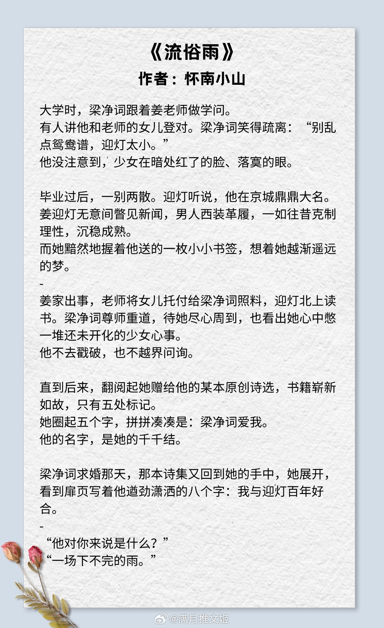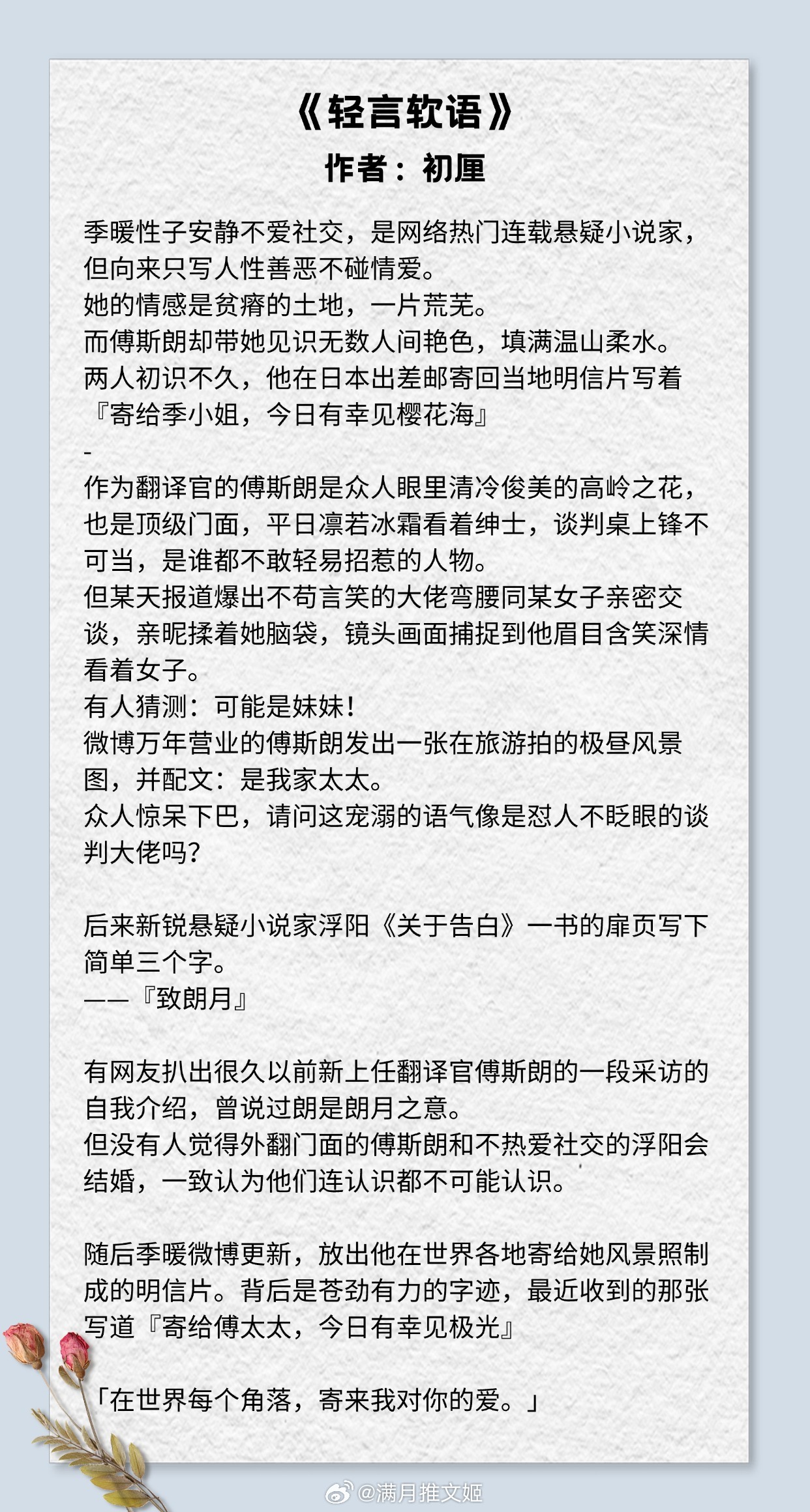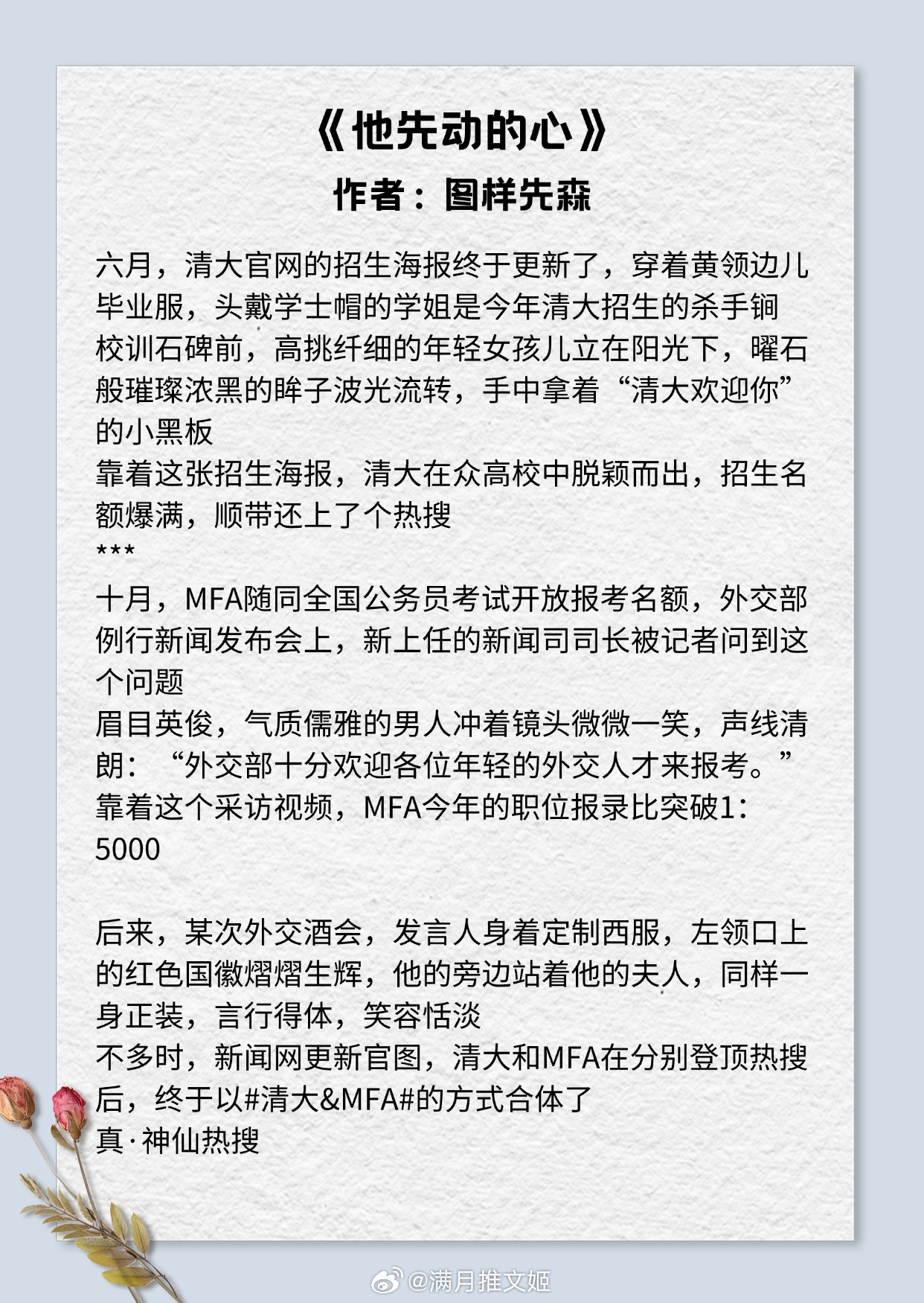 【外交官男主文】在世界每个角落,寄来我对你的爱。《非正式婚姻》作者:雾里青《与渡》作者:苏格兰折耳猫《投其所好》作者:姜之鱼《他先动的心》作者:图样先森《清晨心动》作者:孟五月《轻言软语》作者:初厘《坠月》作者:池木栖《暗恋巴比伦》作者:六经注我《流俗雨》作者:怀南小山推文言情小说推荐推文