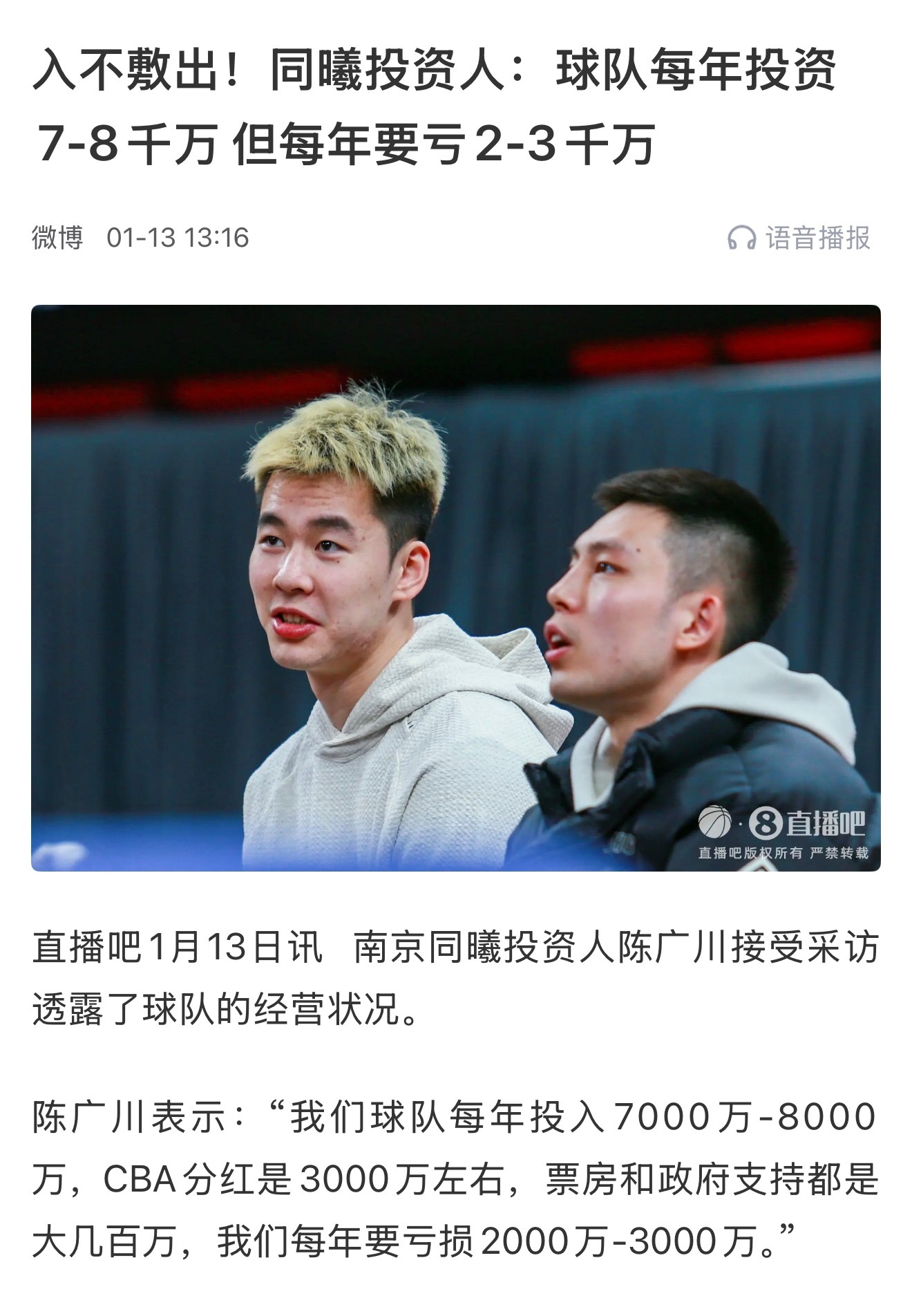 南京同曦投资人表示,球队每年投资7000-8000万 cba