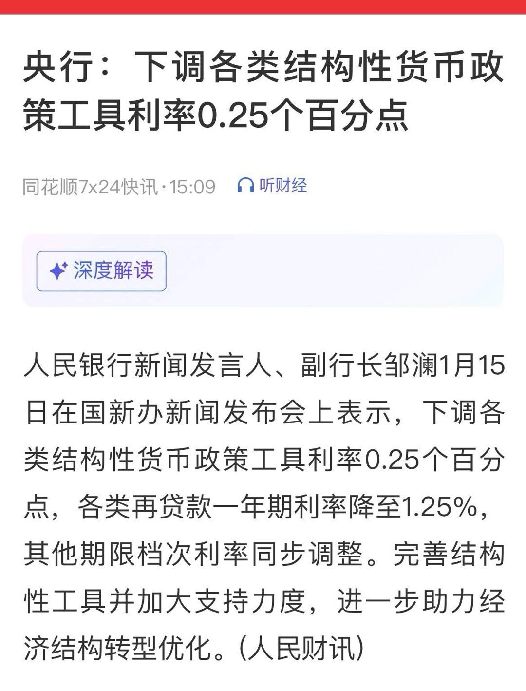 这是一次定向精准的结构性降息,一年期再贷款利率降至1.25%,引导银行低成本资金投向重点领域,助力结构转型,兼顾稳增长与防风险,对A股相关板块形成利好,也利好债市。一、政策要点• 下调各类结构性工具利率0.25个百分点,一年期再贷款降至1.25%,其他期限同步调。• 完善工具、加大力度,定向支持科创、绿色、小微、乡村振兴、保障性住房等重点领域。• 结构性工具是央行对银行的再贷款,通过“量价结合”引导信贷结构优化。二、为何此时出手• 国内:经济弱复苏,有效需求不足,重点领域融资成本仍需降低。• 外部:美联储进入降息周期,外部约束缓解,国内政策空间打开。• 节奏:春节前靠前发力,助力年初信贷“开门红”,提振市场信心。三、对各方影响• 🏦 银行:每年可节约资金成本约150-200亿元,息差压力缓解,提升服务重点领域积极性。• 🧑💼 实体:重点领域企业融资成本下行,小微、科创、绿色等企业受益更直接,带动投资与经营改善。• 📈 股市:利好银行、地产、小微金融、科创、绿色等板块;与“快牛”行情形成正向共振,强化价值重估逻辑。• 📉 债市:短期利好利率债,推动收益率下行;信用债风险溢价收窄,融资环境改善。• 💸 流动性:保持总量充裕,不搞“大水漫灌”,聚焦精准滴灌,兼顾稳增长与防风险。四、投资启示• 理念:坚守“业绩增长+估值低位”策略,关注政策支持的低估值成长方向。• 方向:1)银行(息差改善,资产质量优化);2)地产(保交楼、保障性住房工具加码);3)科创与绿色(再贷款支持力度加大);4)小微金融(支农支小再贷款激励增强)。• 节奏:理性看待短期波动,逢低布局政策受益且基本面扎实的标的,避免追高,做好风险控制。五、总结此次结构性降息是“精准发力、定向滴灌”的体现,既降低实体经济融资成本,又优化信贷结构,为经济转型与市场稳定注入动力。对投资者而言,应把握政策红利,聚焦价值与成长共振的领域,在理性中把握机遇。…………………………………….以上内容来自Al解读。