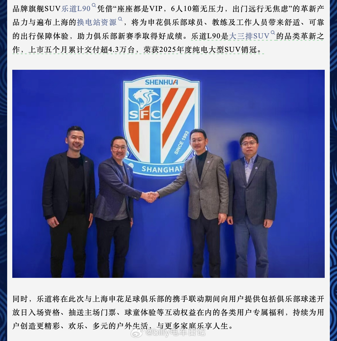 补充说明一下,乐道这次和申花是“合作伙伴”,不是“冠名赞助”,部分城市球迷可以不用尴尬了。一家足球俱乐部的合作方式有非常多样的,比如球衣赞助(如耐克阿迪),冠名(北京国安、浙江绿城、前广州恒大)、球衣胸前广告赞助(国安的JD、上港的上汽、浙江的零跑、申花的交通银行等)、还有更多多种多样的合作方式。以北京国安举例,京东是他们的顶级合作伙伴兼胸前广告赞助商;耐克是中超的装备赞助商;北京罗森、康玛士也是合作伙伴之一。从官方信息来看,目前乐道和申花的合作内容是:申花俱乐部球员、教练及工作人员带来舒适、可靠的出行保障体验俱乐部球迷开放日入场资格、抽送主场门票、球童体验等互动权益上海申花乐道汽车