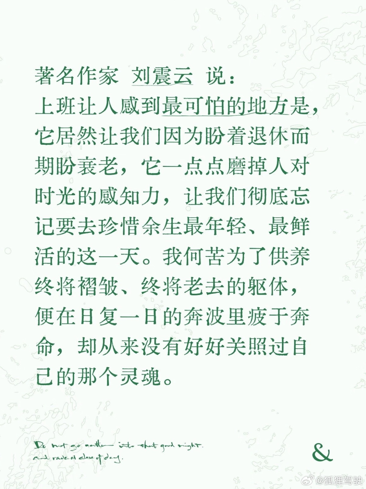 上班最可怕的地方人是会钝的好好珍惜余生最年轻、最鲜活的这一天……请女孩子不要有任何顾虑不要在意任何人的眼光,趁年轻穿任何想穿的衣服,化自己想要的美丽的妆容,呵护我们年轻的肉体。男生一样,勇敢追逐梦想,不要给自己的当下设限,珍惜年轻的肉体可以去到的远方。有一天,真的退休了,我们有可能反而玩不动了。我们都以为,退休了就好了,就轻松了,而人生也就过半了,我们最美好的青春,一去不复返了,人生再也不可以重开了……