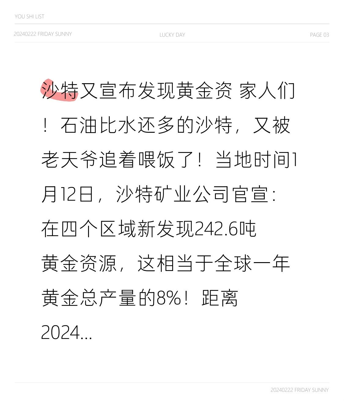 沙特又宣布发现黄金资 家人们!石油比水还多的沙特,又被老天爷追着喂饭了!当地时间1月12日,沙特矿业公司官宣:在四个区域新发现242.6吨黄金资源,这相当于全球一年黄金总产量的8%!距离2024年发现125公里“超级金矿带”才两年,沙特的黄金储备直接原地暴涨,这波操作到底藏着什么野心? 更吓人的是,这次发现的还只是“冰山一角”!地质勘探显示,新矿体在地下深处仍然“开放”,意味着往下挖还能找到更多黄金。其中曼苏拉-马萨拉矿区最夸张,两年前预估只有46.6吨储量,现在直接飙升到323.5吨,翻了7倍还多;瓦迪贾乌地区更是首次探金就收获95.8吨,相当于凭空捡到一座“黄金山”。 但第一个反转来了:沙特发现这么多黄金,国际金价竟然纹丝不动?券商首席分析师直接点明真相:黄金价格根本不靠供给说了算!现在全球金价主要看美联储降息节奏和地缘政治风险,本质是对冲美元信用的工具,沙特这点新增产量,对全球市场来说只是“毛毛雨”。简单说,这波发现只会让沙特更富,咱们想买金镯子的,别指望降价了! 第二个更关键的转折:沙特疯狂挖黄金,根本不是为了卖钱!作为石油王国,沙特早就靠石油赚得盆满钵满,现在拼尽全力找黄金,背后是“2030愿景”的大棋——摆脱对石油的依赖,打造“石油+矿产”双支柱经济。要知道,沙特之前的黄金储备就有323吨,稳居阿拉伯国家第一,现在新矿加持,加上已发现的铜、镍等新能源关键矿产,未来采矿业对GDP的贡献要冲到499亿美元,还能创造16万个就业岗位。 更绝的是,这些黄金藏着金融大算盘!在全球去美元化的浪潮中,黄金是最硬的“压舱石”。沙特一边用石油绑定人民币结算,一边疯狂囤积黄金,相当于给自己的经济上了双保险,既巩固国际信用,又能在全球贸易中掌握更多话语权。而且新发现的矿区还伴生铜、镍等宝贝,这些都是新能源汽车、储能设备的核心材料,刚好踩中全球能源转型的风口。 可能有人会问:沙特这么多黄金,普通人能分一杯羹吗?答案是“能间接受益”!为了开发矿产,沙特已经吸引320亿美元全球投资,和中国紫金矿业等企业都有合作,未来矿业产业链会带动更多就业和贸易机会。但对咱们来说,更该看清一个真相:资源永远是硬实力,沙特从“靠石油吃饭”到“多矿产布局”,其实是所有国家发展的缩影——只有手里有真东西,说话才有底气。 其实沙特的野心远不止于此。目前它已发现48种矿产,待开发资源总价值高达2.5万亿美元,仅次于俄罗斯和美国。未来随着这些矿产逐步投产,沙特不仅能摆脱石油依赖,还能在全球新能源供应链中占据关键地位,从“石油王国”变身“资源超级大国”。 这波黄金大发现,再次证明了“家里有矿”的底气有多足。在复杂的全球格局中,谁掌握更多核心资源,谁就掌握了未来的主动权。而对我们普通人来说,看清资源背后的战略布局,才能更好地理解世界的变化。 评论区说说,你觉得沙特接下来会疯狂挖金吗?全球资源格局会因此改变吗?关注我,带你看透更多国际财富密码,看清谁才是真正的“隐形富豪”!