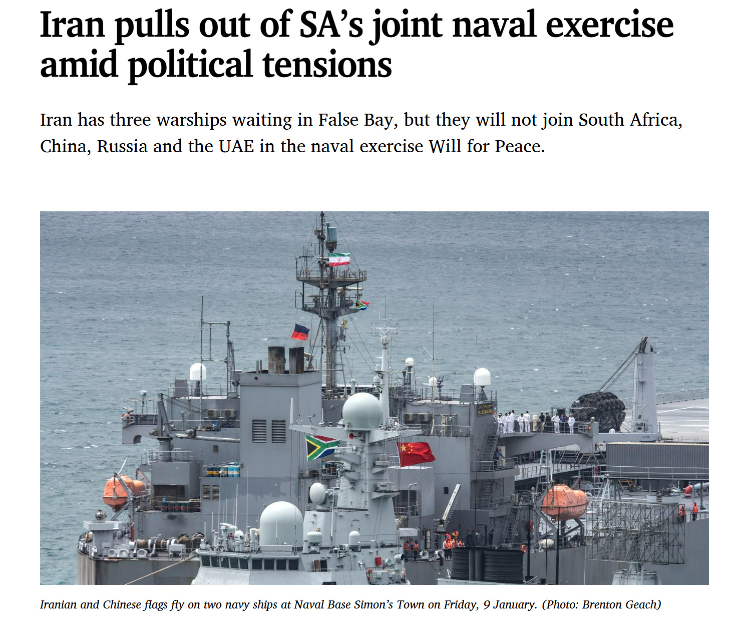 紧急回国支援?伊朗军舰临时退出了在南非举行的中俄伊南联合演习!据南非媒体的报道称,目前伊朗军舰已退出在南非举行的金砖国家“和平意志-2026”联合军演。据悉,上周伊朗海军已经派出了3艘军舰前往南非,并计划在本周周一、周二举行中国、俄罗斯、南非、伊朗以及阿联酋等多国举行的“和平意志-2026”海上演习,但最新消息显示伊朗军舰已经决定不再参加。不少分析认为,伊朗巨舰退出此次的金砖国家联合演习,可能是怕刺激到美国,或者紧急回国支援,以防止美国攻击伊朗……烽火问鼎计划热点观点