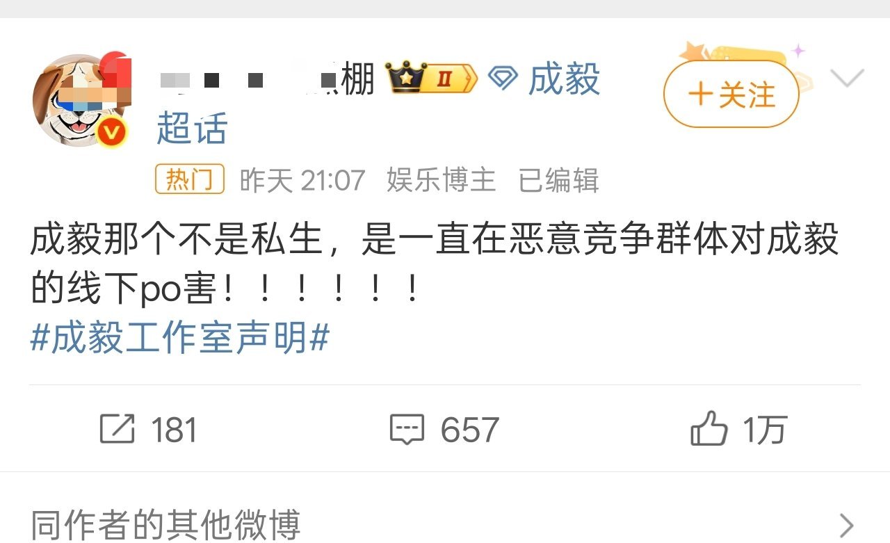 成毅工作室声明粉丝透露是是竞争群体对成毅的po害,并不是简单的ss