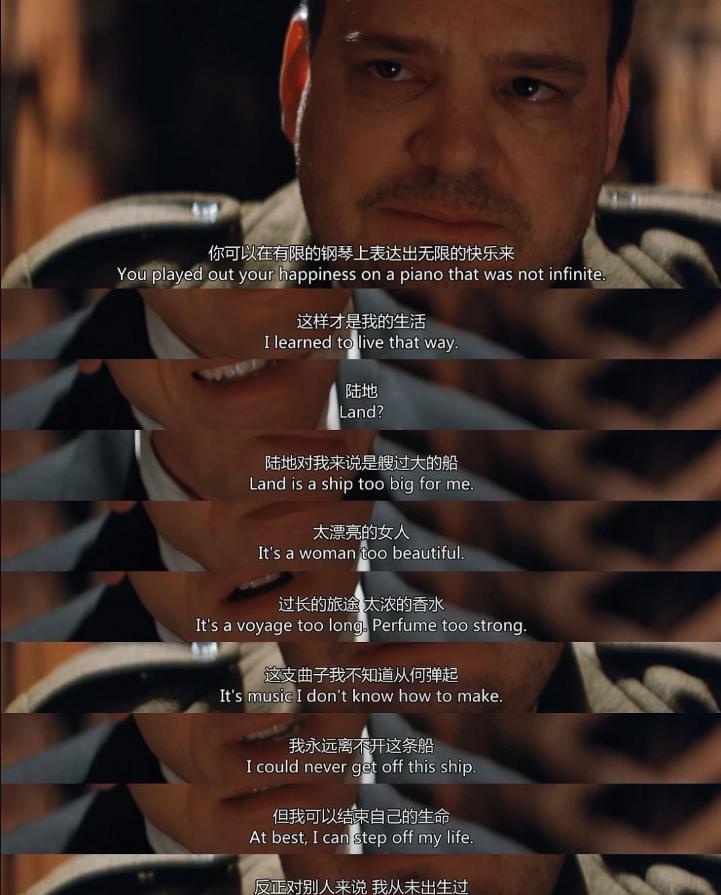 电影《海上钢琴师》:钢琴成就了他也困住了他。 这部电影的主角1900,是一个被抛弃在游轮上的弃婴,他被游轮上的锅炉工在钢琴上捡到,因为那一年是1900年,所以他的名字就叫1900。 或许,被遗弃在钢琴上就已经证明了,他的后半生都要和钢琴结缘。 1900在8岁时,他的养父被轮船上的铁链砸中,受重伤不治而亡。 本来要被送上陆地福利院的1900,因为突然间展露的钢琴天赋,被船长破格留在了船上弹琴。 随着时间流逝,1900的琴技越来越好,船上的游客但凡听到过他琴声的,都被深深的折服。 他也成为了这艘船的一张明信片,很多人都慕名而来。 这天,船上来了一位小号演奏家麦克斯,初登船的他很不适应摇晃的大船。 1900出现,他带着麦克斯坐在没有锁定的钢琴上,随着轮船摇晃,钢琴也在船上四处晃荡。 尽管看着十分凶险,但麦克斯却克服了晕船的问题。 代价是,两人被船长安排到锅炉房打工一个月,以赔偿被钢琴撞坏的装饰。 两人因此结缘,麦克斯注意到了这个天赋异禀的钢琴天才,两人时常交流音乐,成为了无话不谈的好朋友。 也是在这期间,1900的名声越传越远,大家都知道了这艘船上有一位传奇演奏家。 他不图名利,不为炫技,不拘泥于格式,只为传达音乐的美好。甚至有很多陆地上的议员都慕名来到船上看他演奏。 但名气大了,引来了不一定全是仰慕者,也有挑战者。 一位自称爵士乐发明者的杰利带着一众记者登上游轮,要与1900对决琴艺。 两人你来我往大战了三个回合,前两次以杰利稍占上风,因为在1900的认知里,音乐不分高低,其中内含的感情才是最重要的。 但第三回合,杰利为了赢弹了一首纯炫技的钢琴曲目,他的音乐态度激怒了1900,他弹奏了一首需要两个人才能演奏的四手联弹,稳压杰利一头赢下了对决。 至此,1900真成了钢琴界独树一帜的存在。 很多人都劝说1900到陆地上发展,因为按照他的琴技,肯定能大放光彩。 1900只是随口一听并没有放在心里,因为只有在船上他才能感觉到安心。 无奈,唱片公司只得将录音设备搬到船上,记录下1900的琴声。 就在1900录制期间,舷窗外的一个女孩吸引了1900的注意,因为这个女孩1900的琴声变得柔软似水。 一曲录制完,唱片公司被惊艳了,1900平静的内心也被打破,脑中始终回想着女孩的样貌。 1900没有让唱片公司拿走自己的这张唱片,因为他要将唱片送给这个女孩。 但在尝试了几次之后,这张唱片还是没有送出去。女孩也因为到了目的地要下船。 1900鼓足勇气追上去,女孩在1900脸上留下一吻和自己的地址后,就被下船的人潮淹没了。 思前想后的1900决定下船寻找自己的幸福,他的这个决定获得了全船人的支持。 1900站在船和陆地之间的悬梯上,望着陆地上的高楼大厦,他害怕了。 害怕自己不能再掌握自己的命运,害怕自己被陆地上的繁华淹没,害怕没有一块属于自己的地方。 最终,1900还是返回了船上,决心再不下船。 多年后,麦克斯回到了陆地上发展,1900告别了自己的这一位挚友。 又很多年过去,在陆地上的麦克斯偶然间听闻,1900所在的那艘船要被炸毁。 麦克斯疯了似的来到船上寻找,他在船上的每一处地方,播放着1900当时录制的那张唱片。 原来,1900将那张没送出去的唱片掰碎扔在了垃圾桶,后来被一个典当行的老板拼凑收录了起来。 经过一段时间寻找,1900主动现身,两人坐在废弃的船舱里促膝长谈。 1900拒绝下船,他表示自己生在船上,长在船上,船头到船尾就是自己的世界,他适应不了陆地的生活。 就这样,麦克斯含泪走下了船,这艘游轮也在火光之中,化为了一堆残渣。 至此影片全部结束。 有人说1900太过固执,是一位疯狂的艺术家,但实则不然,他才是真正的清醒者面对现实世界的诊断。