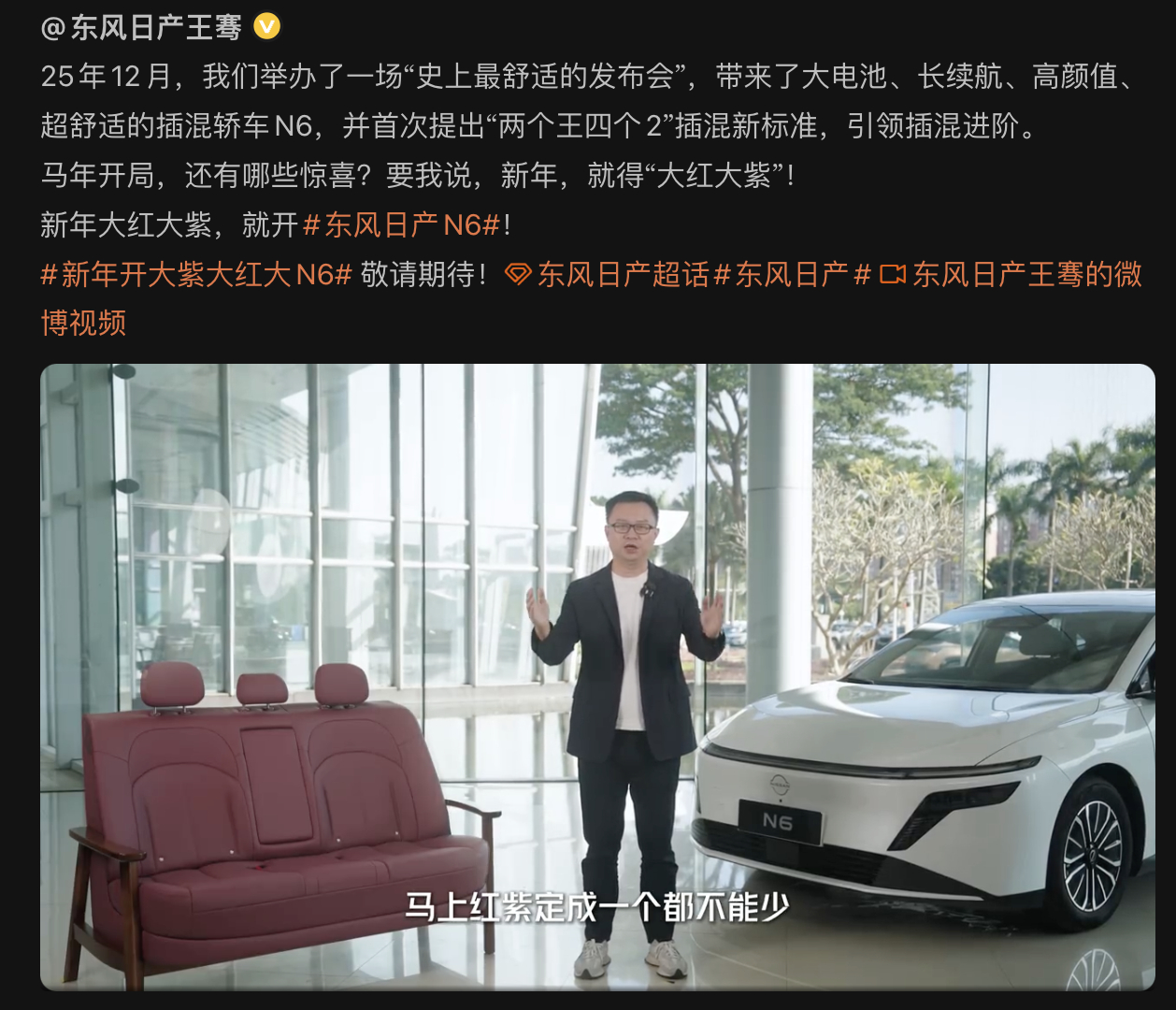 日产N6发布内饰新颜色 新颜色竟然用沙发首发了今天发布了一条微博视频,回顾去年N6发布会的同时,还预告了1月15日的上新。马上红紫定成啥的,过年的气氛慢慢起来了