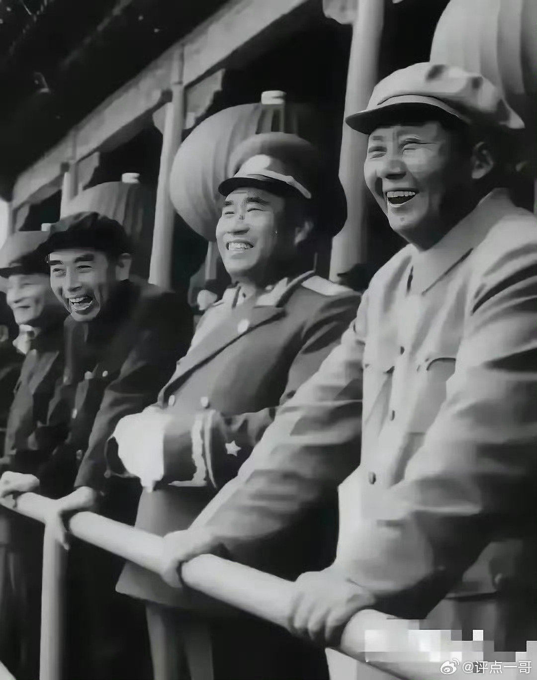 三位战友开怀大笑!他们并肩战斗数十载的,共同走过万里长征、历经烽火硝烟,终于迎来可以尽情欢笑的胜利时刻。历史巨人的笑容,照亮后辈奋斗的路。功绩千秋,永垂不朽!