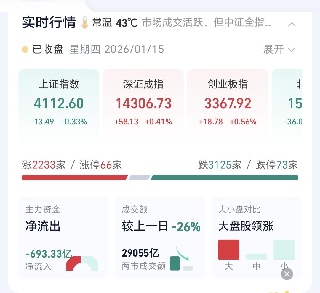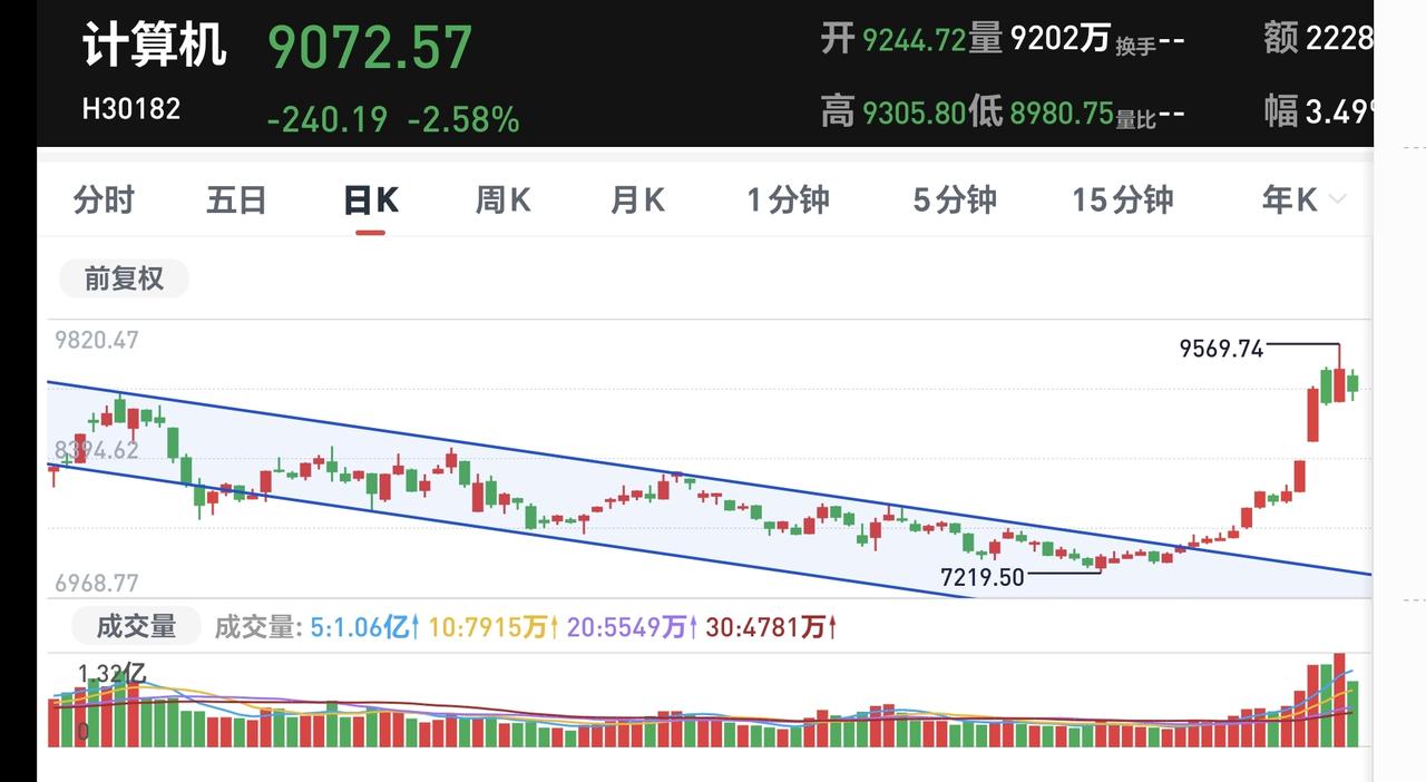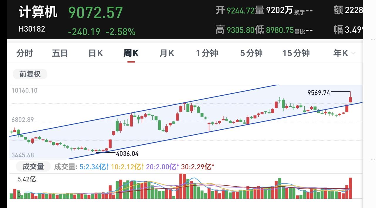基金:明天市场会不会有反弹 今天市场低开以后探底回升,收盘的时候三大指数涨跌不一,创业板指和深成指上涨,上证指数小跌,创业板指上涨了0.56%,收于3367点,上证指数下跌了0.33%,收于4112点,涨跌幅度都不大。 整个股票市场,上涨2233家,下跌3125家,涨停66家,跌停73家,上涨家数少于下跌家数。 今天两市累计成交29055亿,相比于昨天缩量了26%,内资净流出871亿。 持有的基金中,下午收盘的时候,估值上涨幅度最大的三个板块是:5G板块,兴全合宜,芯片半导体板块,估值下跌幅度最大的三个板块是:可控核聚变板块,证券板块,医疗板块,估值整体亏损了1673元。 整个基金市场,上涨12937家,下跌6119家,上涨幅度超过5%的4家,下跌幅度超过5%的23家。 图9是今天基金的上涨排行榜,图10是今天基金的下跌排行榜,图11是ETF上涨幅度排行榜,图12是今天基金的加仓榜,图13是今天基金的减仓榜。 1:今天收盘的时候,五天线位置是4132点,收盘点位4112点,收在了五天线之下,明天继续观察能不能重新站上五天线,今天是跌破五天线的第二个交易日,三天内不能站上五天线就是有效破位,明天是最后一个交易日,明天如果不能站上五天线,就是有效破位。 2:今天两市累计成交29055亿。相比于昨天缩量26%,超过了20%的缩量幅度,大幅度缩量说明资金进场意愿不强烈,今天继续观察成交量,看看会不会继续缩量,特别是明天反弹的过程中,如果没有资金进场,那后市是需要谨慎的。 3:我们来看一下下面的截图14,这是主力资金进出板块的情况,主力资金净流入最多的三个板块是:电子板块,高端制造板块,大科技板块,主力资金净流出最多的三个板块是:人工智能板块,国企板块,计算机板块。 4:我们来看一下下面的截图15,这是高端制造板块日K线图,从图中可以看出,我画了两条倾斜向上的斜线,这是高端制造板块日线级别上涨通道,现在的位置处于这个上涨通道中,也就是说,高端制造板块日线级别属于上涨趋势中,持有的人可以继续持有,除非跌破这个上涨通道的下轨,才可以考虑要不要止盈出来观望。 我们来看一下下面的截图16,这是高端制造板块日K线图,从图中可以看出,我画了两条倾斜向上的斜线,这是高端制造板块周线级别上涨通道,现在的位置处于这个上涨通道中,也就是说,高端制造板块周线级别处于上涨趋势中,长线持有的人可以继续持有,除非跌破这个上涨通道的下轨,才可以考虑要不要止盈出来观望。 5:我们来看一下主力资金净流出比较多的计算机板块,看下面的截图17,这是计算机板块日K线图,从图中可以看出,我画了两条倾斜向下的斜线,这是计算机板块日线级别下跌通道,前段时间上涨突破了这个下跌通道的上轨,也就是说,计算机板块日线级别下跌趋势已经被改变。 我们来看一下下面的截图18,这是计算机板块周K线图,从图中可以看出,我画了两条倾斜向上的斜线,这是计算机板块周线级别上涨通道,前段时间下跌跌破了这个上涨通道的下轨,上周的上涨又回到了这个上涨通道内,本周是在上涨通道内震荡,也就是说,计算机板块周线级别是处于上涨趋势中,持有的人可以继续持有,除非跌破这个上涨通道的下轨,才可以考虑要不要止盈出来观望。 市场明天还会有反弹,反弹的过程当中需要观察资金进场的力度,如果反弹过程中有大资金进场,成交量上表现为放量,近期就还会再创新高,如果反弹过程当中没有大资金进场,弱反弹之后还会继续震荡调整。 大家帮忙评论点赞转发,我花半个小时写,你花几秒钟点赞评论转发,评论点赞和转发是一种美德,谢谢大家的支持。 我每天都会分享我的观点,我的观点只代表我个人的看法,不能作为你操作的依据,据此操作后果自负。