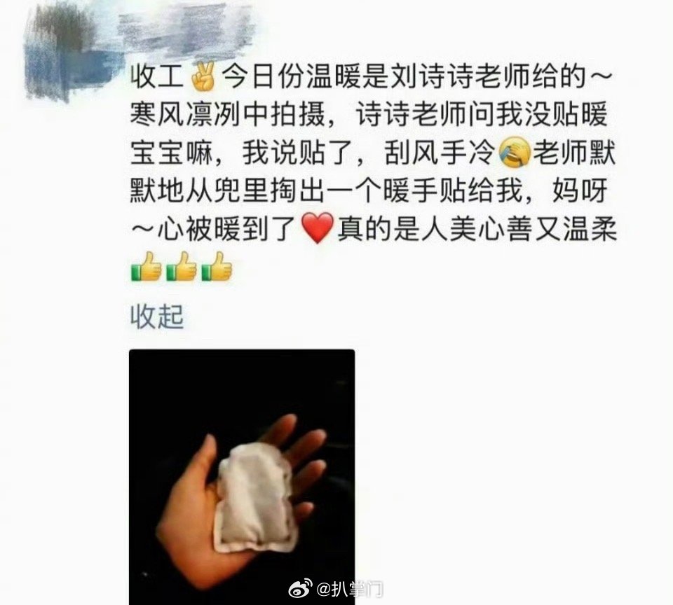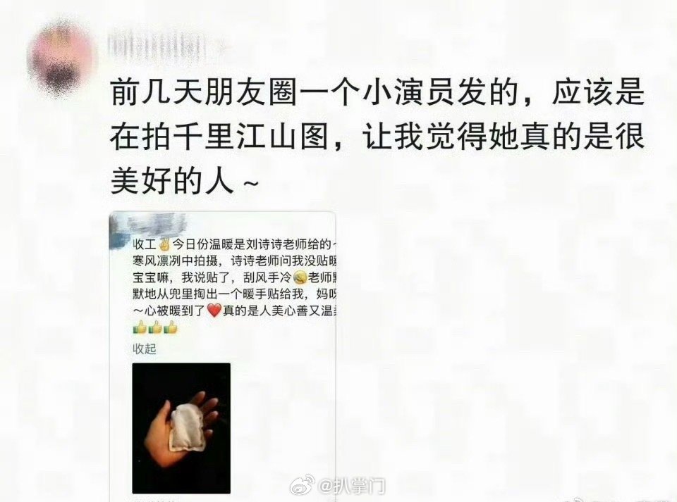 千里江山图小演员感谢刘诗诗果真是人美心善的刘诗诗啊,电视剧《千里江山图》热拍ing,有小演员发文感谢刘诗诗,说刘诗诗在拍戏的时候给小演员送暖宝宝,咱们的大美女很是暖心啦,期待刘诗诗在新剧的表现!刘诗诗给小演员送暖宝宝