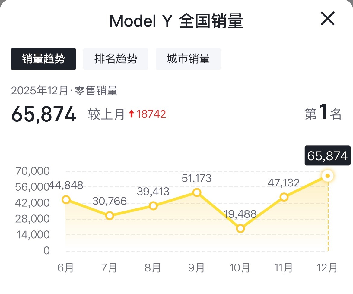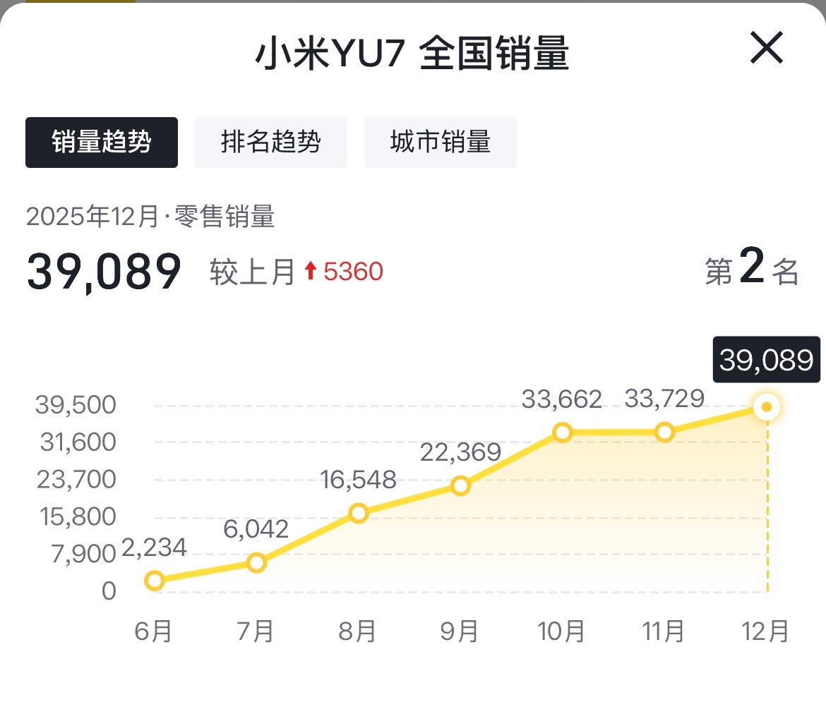 Model Y十二月份又拿了销量冠军在所有车型中,model y十二月份销量排名断崖第一。当十月份销量跌破2万台时,很多人都说Model Y不行了,有说技术落伍的,有说配置跟不上的,这不但没有不行,而且简直是一飞冲天。在所有车型中,无论从价位,还是从定位,小米yu 7跟model y都是劲敌,小米十二月份销量3.9万台,排名第二。而且随着小米产能提升,这个数据还在快速提升。你们觉得小米yu 7最终能打败model y吗?新能源汽车小米汽车特斯拉