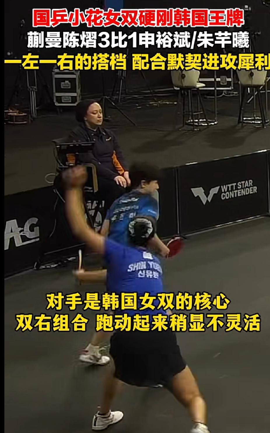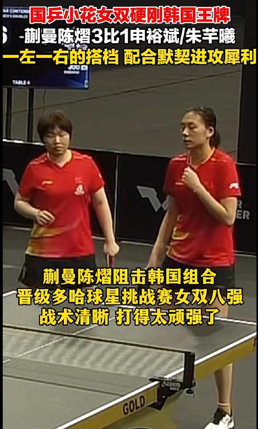 国乒小花硬刚韩国王牌!蒯曼陈熠3比1强势晋级 WTT多哈球星挑战赛女双赛场,蒯曼/陈熠组合以3比1力克韩国王牌申裕斌/朱芊曦!一左一右的搭档配合默契,进攻犀利,战术清晰,打得相当顽强,成功晋级八强👏 国乒小花好样的,继续冲! 蒯曼陈熠女双获胜 国乒
