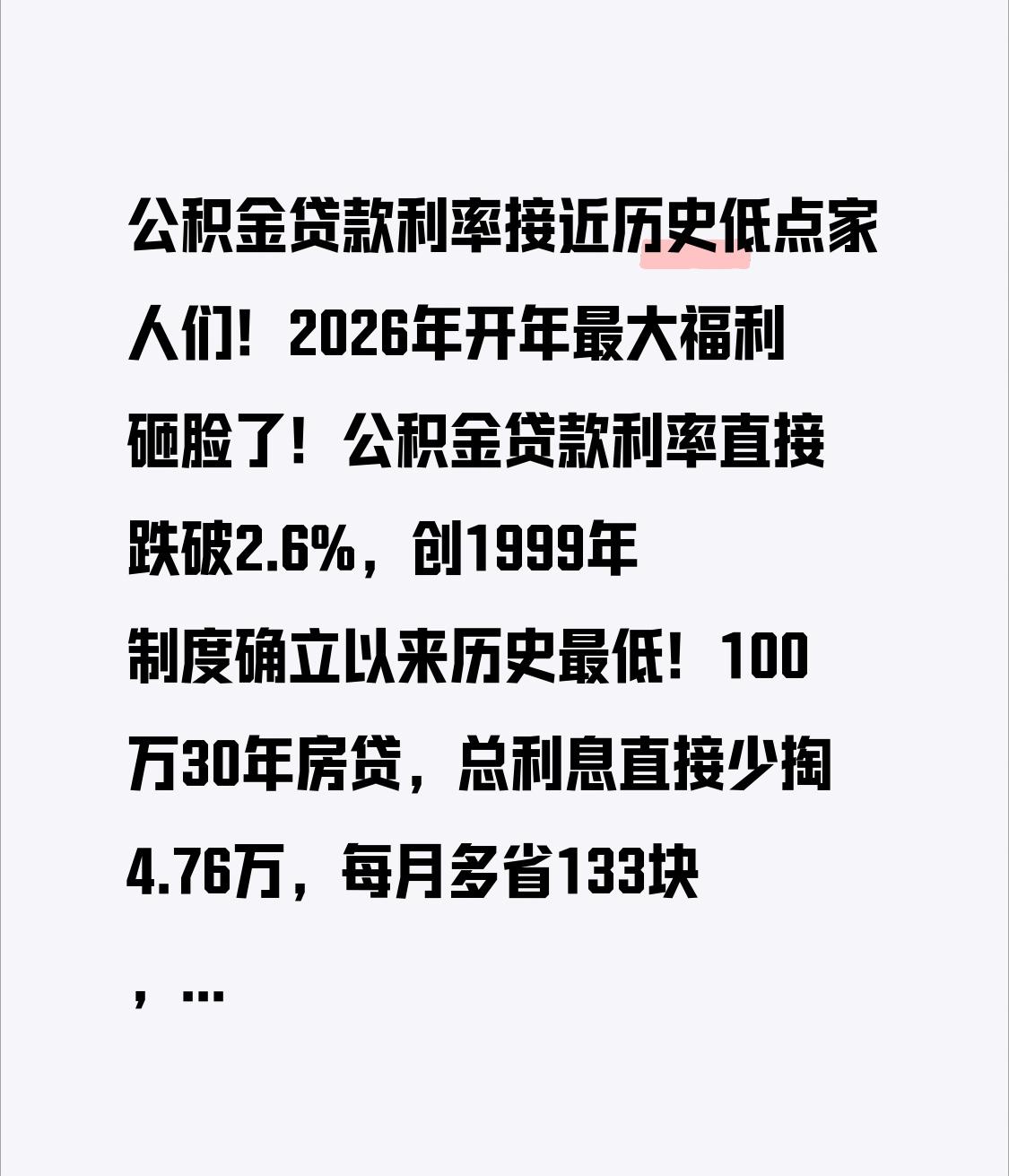 公积金贷款利率接近历史低点 家人们!2026年开年最大福利砸脸了!公积金贷款利率直接跌破2.6%,创1999年制度确立以来历史最低!100万30年房贷,总利息直接少掏4.76万,每月多省133块,相当于白拿一年物业费+全家旅游基金!但这波红利不是人人能享,3个隐藏坑踩了直接亏大,看完再决定要不要上车! 先给大家算笔明明白白的账:现在公积金首套5年以上利率2.6%,比2025年降了0.25个百分点。100万贷30年,等额本息月供从4136元降到4003元,30年总利息从49.09万砍到44.33万,省出的钱够给孩子报3年兴趣班,或者换台最新款家电!二套房也跟着降,5年以上利率3.075%,100万30年总利息省5.9万,月供少156元,刚需和改善族都能沾光。 但第一个惊喜转折来了:这波降息不用你跑断腿申请!2025年5月8日前办的存量公积金贷款,2026年1月1日起自动调整利率,系统直接改,月供从2月开始自动减少,完全“免申即享”。北京的郭女士已经收到银行通知,她50万20年的贷款,每月能少还61.65元,直呼“天上掉馅饼”! 第二个更劲爆的转折:利率降了,贷款额度还暴涨!现在多地最高可贷144万,南京多子女家庭买绿色住宅,夫妻双方最高能贷144万;贵州高层次人才直接放宽到150万;武汉卖了唯一住房再买房,还能按首套利率算。相当于“低利率+高额度”双buff,以前贷不够的现在可能直接全款不用补差价,刚需族的买房门槛直接砍半! 但别高兴太早,第三个转折藏着3个致命坑,90%的人都容易踩!第一,1月还款可能“反向上涨”:因为1月是新旧利率分段计息,部分天数按旧利率算,首月月供可能微增,2月才会稳定下降,别看到账单慌了以为政策没生效;第二,组合贷只有公积金部分降息,商业贷款部分要看重定价日,选1月1日重定价的才能同步降,不然只能羡慕别人省钱;第三,额度不是想贷多少就贷多少,最终要看你的缴存余额、还款能力,比如缴存年限短、余额少,就算最高可贷144万,你可能只能贷50万,白欢喜一场。 还有两个关键提醒,关系到你能不能吃透政策:第一,多地取消了两次公积金贷款的时间间隔,首套还清立马能贷二套,换房族不用等;第二,灵活就业人员现在也能自主缴存公积金了,以前没单位交的个体户、自由职业者,现在自己交也能享受低利率,买房路又宽了一截。 但也有人吐槽“每月省100多块,不如房价降10万实在”,这话没毛病,但对刚需来说,利率下降+额度上涨+首付比例20%,三重政策叠加,买房压力确实少了一大截。现在不是纠结房价涨不涨,而是先搞清楚自己能不能用公积金:连续缴存6个月以上、账户正常、没有未结清的公积金贷款,这三个条件缺一不可。 其实这波政策的核心,就是帮真正的刚需解决住房问题。利率接近历史低点,额度又放宽,对想买房的年轻人来说,相当于国家在帮你“减负”。但一定要记住:买房是大事,别因为利率低就盲目上车,先算清自己的还款能力,确认好贷款额度,避开分段计息的坑,才能真正享受到福利。 2026年的买房窗口已经打开,利率低、额度高、流程简化,刚需族可以抓紧时机上车了。评论区说说,你现在有多少公积金余额?能贷到最高额度吗?关注我,下期分享公积金贷款申请全流程,带你花最少的钱办最稳的事,早日实现买房梦!