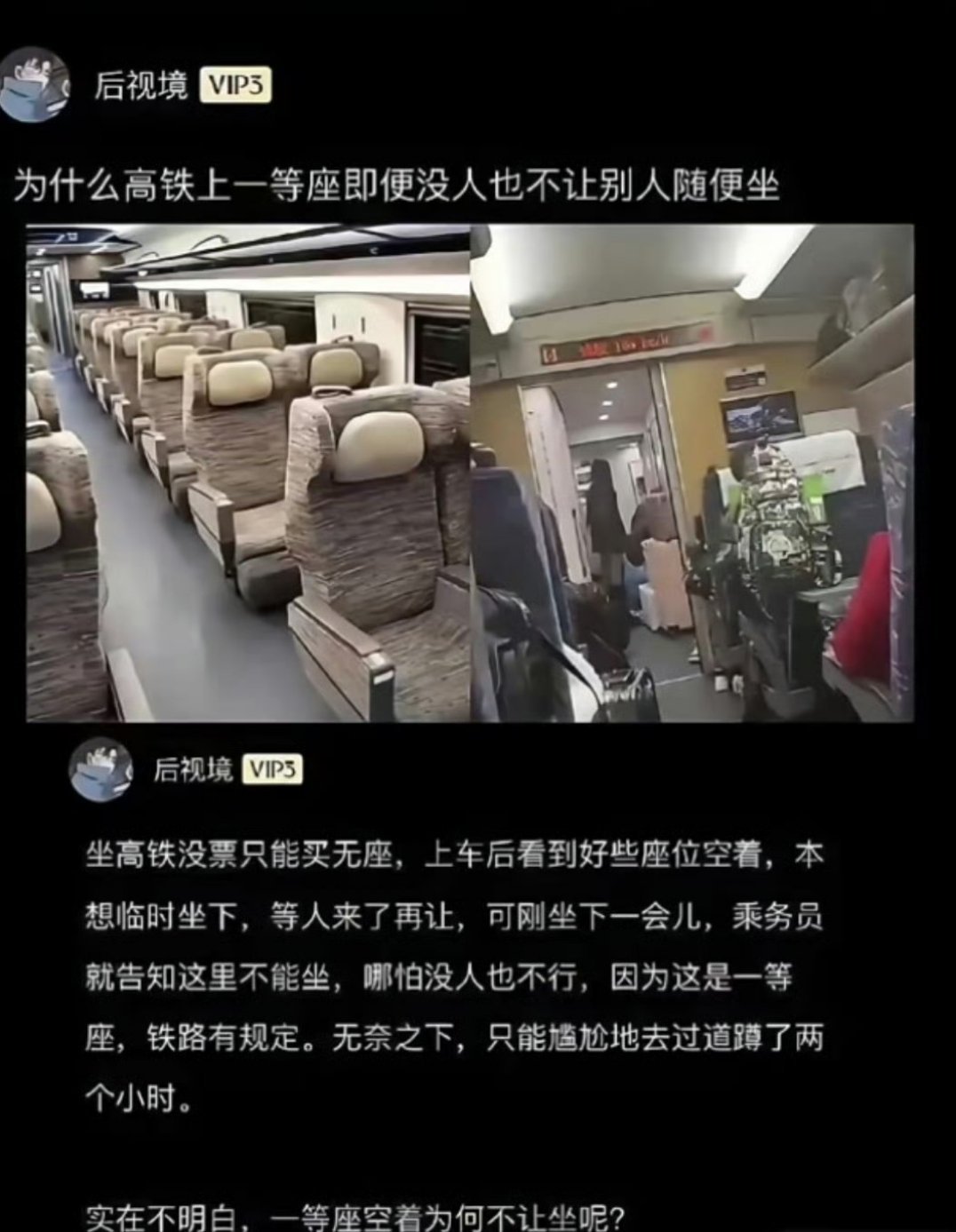 12306回应一等座禁止无座乘客逗留 特认同一等座拒无座逗留,高价换的就是清净不挤,要是随便进随便待,那额外花的钱不就白花了,纯纯冤种。
