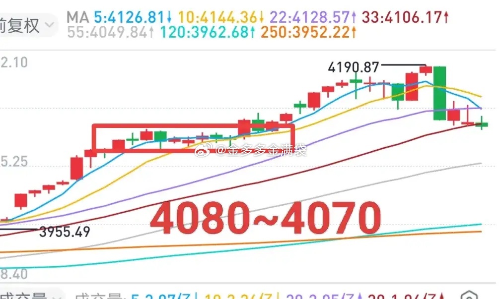 A股:事实证明,要把金姐对大盘的预测放在心上,否则可能比较难受!市场不仅是降温这么简单,同时伴随着结构性重组。1,市场简述昨天最高4190点,早盘最低4097点,100点转眼即逝。今天开盘前,金姐提到了MA10均线。目前,MA10均线上升到了4090点一线。盘中低点4097点,距离MA10均线不远了。商业航天板块,高标股遭遇屠杀。跌停及跌幅超过10%的个股近40只,而沪深两市跌停个股才54只。跌幅榜前列,几乎都与商业航天有关。沪深两市早盘成交金额1.90万亿左右,较昨天同期下降了不少。估计全天成交金额在3万亿左右。缩量了,但3万亿左右的成交金额还是不小的。2,降温缘由对于市场的降温,不少人把原因归咎于监管,不是完全没有道理。但,实际上,大盘的调整迹象早已有之,只是多数投资者没看到,或者不愿意相信罢了。金姐提过数次背离的问题,不仅是分时级别背离,还有周线级别的背离。PS:背离出现之后,大盘或个股不一定马上兑现下跌,但这个修复迟早都是要到来的,无非是挣扎时间长短而已。金姐周末的时候,预测大盘本周回撤的空间有50~100点(图)。3,等待机会市场高标遭遇抛弃,市场就需要重构,资金需要结构性重组,机会也就会在这个过程中出现。4080~4070点这个区域,是金姐昨天盘前提到的支撑区域,看看大盘下午能不能到。个人观点,仅供交流,不构成投资建议!理财有风险,投资需谨慎!A股股市分析A股指数大盘分析行情大盘要跌吗