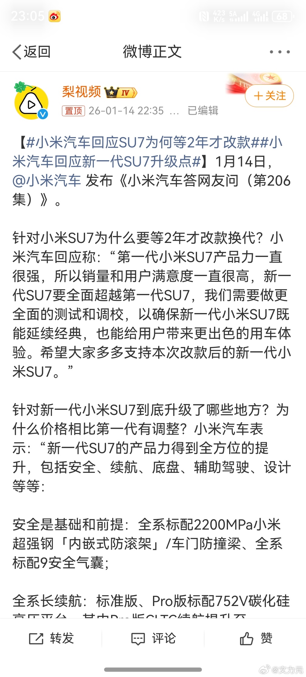 小米汽车回应SU7为何等2年才改款 ,一个万用公式:【产品一直不更新】好的产品一步到位,无需迭代【产品突然又更新】好的产品就应该不断迭代,不停完善当然,这个公式适用于任何企业