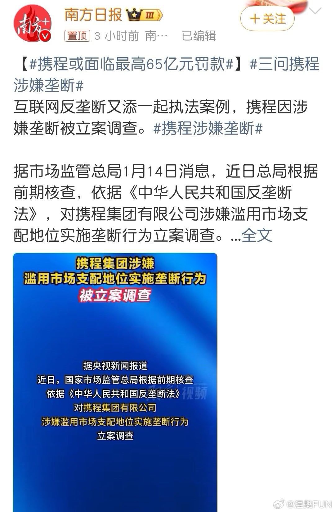 携程或面临最高65亿元罚款日赚2亿靠垄断收割,65亿罚单是公平回敬。平台再大,也不能把商家和消费者当提款机。如果确实垄断,还是要多罚一点才能以儆效尤!携程日赚超2亿元