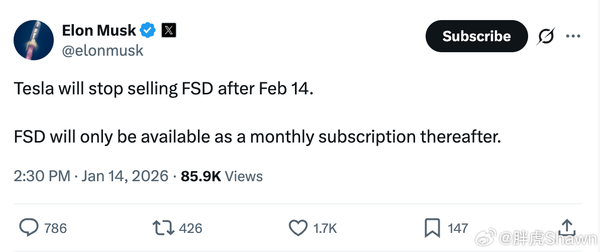 ??老马刚发文:2月14号之后停止销售FSD,仅提供订阅那我们这些已经有FSD的,岂不是绝版了。唯一诉求就是,至少你得永远开放FSD转移吧纯订阅的话,可玩性就很高了,比如赠送xx个月,限时优惠xx折订阅,买车的时候一起订阅打xx折……感觉今年是FSD发力的一年。特斯拉