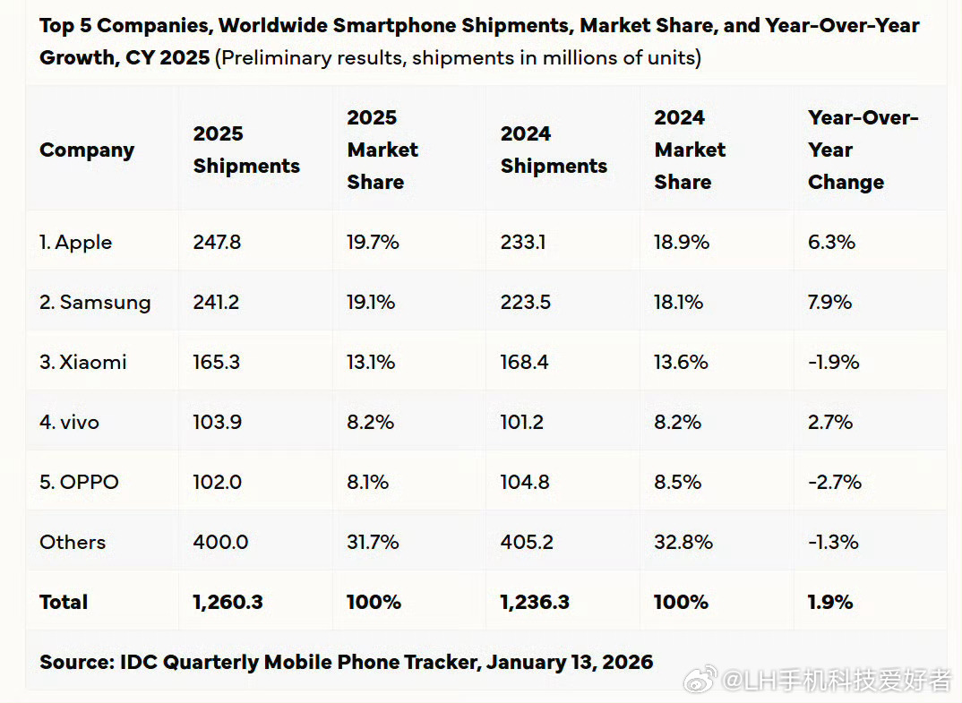 苹果创历史最高出货量苹果手机2025年出货量2.48亿台,创造历史最好成绩,并且超越了三星成为全球第一。这里面,iPhone16系列和iPhone17系列是绝对的功臣,尤其是iPhone17系列,上市就卖爆了。只要把用户吐槽的配置升级,苹果就能大卖,所以它平常挤牙膏也是有资本的,是真的夸张。