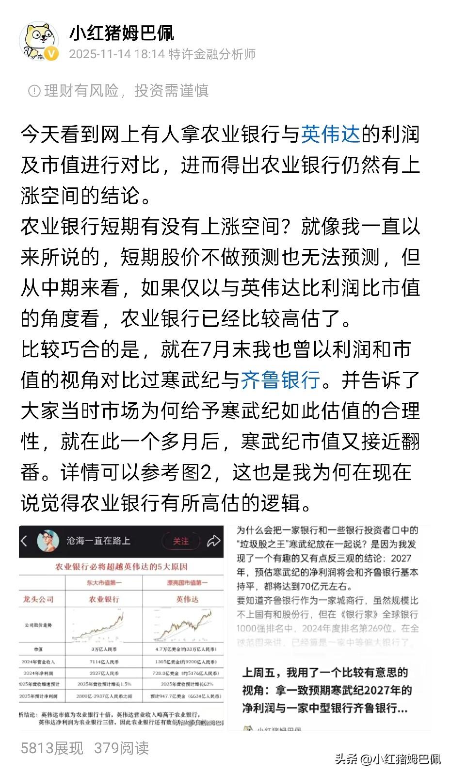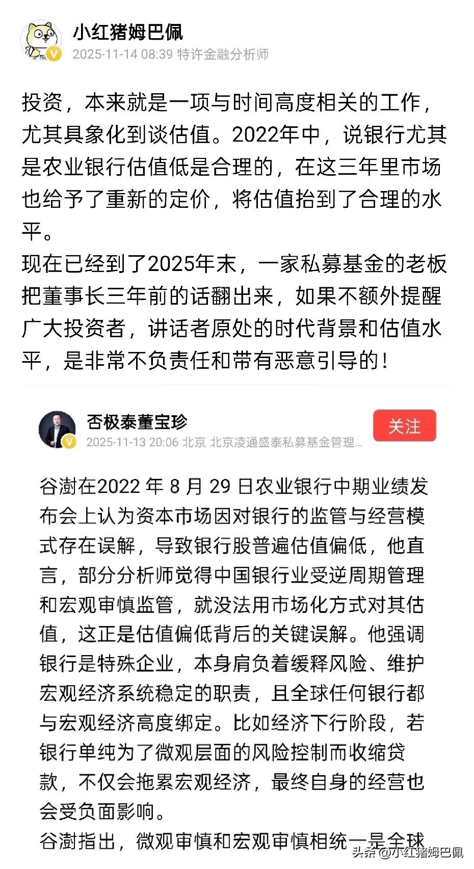 这一年来,我不但向大家提示中国的MAG7投资机会,向大家介绍了一些好标的,介绍科普如何看科技股的逻辑。还在一些公司被高估时,非常及时地提醒大家! 11月14日,我连发两条微头条:提示农业银行已经相对高估并质疑董宝珍不合时宜继续吹捧农行低估。 当时的评论区当然骂声一片,还有人说我要蹭董宝珍的流量。拜托,我不实名只是为了在网上畅所欲言,在现实中,董要见我至少排队三个月都见不上,我犯得着蹭他的流量吗?! 现在,时间可以证明很多问题了。其他科技宽基指数涨幅30%左右的同时,你如果不听我劝,你还损失了15%,活该!