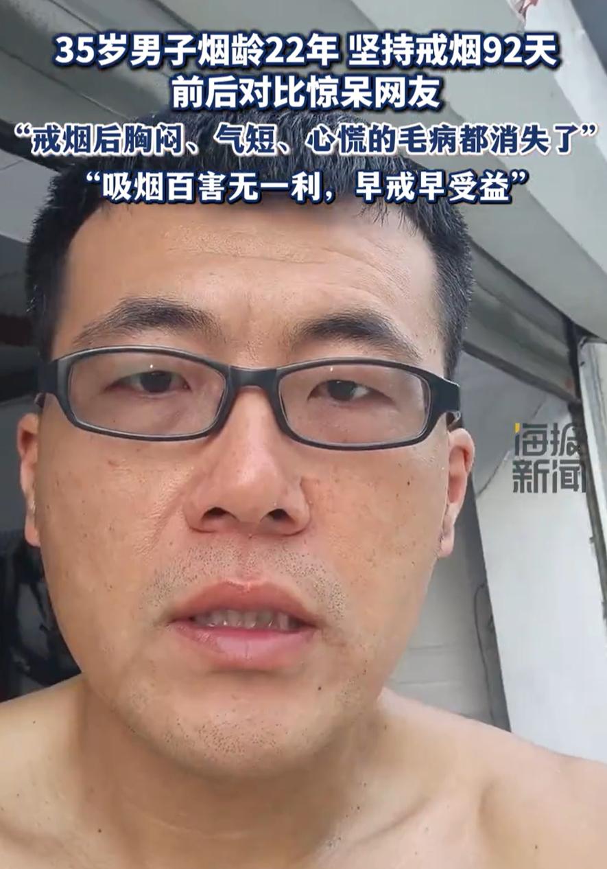 变化真的大!辽宁大连,一名35岁男子却有22年的烟龄,前不久终于决定戒烟,坚持了92天后,他在网上分享起自己戒烟前后的变化,直言身体感觉换了一个人,网友:连容貌都变了 谢先生坦言,自己这么多年抽烟下来,其实并没有感受到什么快乐,反而身体状态越来越差。胸闷、气短、心慌成了家常便饭,总觉得提不起精神。看着身边一些同龄人精力充沛的样子,他渐渐意识到,是时候做出改变了 于是三个多月前,他下定决心戒烟 戒烟的过程并不轻松。头几天最是难熬,坐立不安,总觉得手里缺点什么,心里空落落的。但他这次铁了心,一根都不碰。熬过了最初那段时间,身体开始给出积极的反馈 现在92天过去了,谢先生感觉自己仿佛换了一个人。之前那些胸闷气短的毛病不知不觉消失了,呼吸变得顺畅,早上起床也不再昏昏沉沉。他惊讶地发现,自己的精神状态、体力耐力都有了明显改善,就连身边的朋友都说他气色好了许多,他现在才意识到,抽烟百害无一利,于是把自己的经历和感受分享到网上 对此,不少网友感同身受,分享起自己戒烟后的变化。但也有网友认为,身边有亲戚朋友一直抽烟,身体也没见有什么问题 这种观点其实反映了一个常见的认知偏差,我们容易看到那些“幸存”的例子,却忽略了更多因吸烟导致健康受损的人 每个人的体质不同,对烟草中有害物质的耐受程度也不一样,但大量医学研究已经证实,吸烟会显著增加患肺癌、心血管疾病等多种疾病的风险。那些抽烟多年却看似健康的人,可能是幸运的个体,但不代表烟草无害 我觉得,身体账永远是自己的,舒服还是难受,自己最清楚。谢先生的分享之所以让人有共鸣,不是因为他说了多深的道理,而是让人看到一个普通人,把注意力重新放回到自己身上之后,生活真的会发生变化