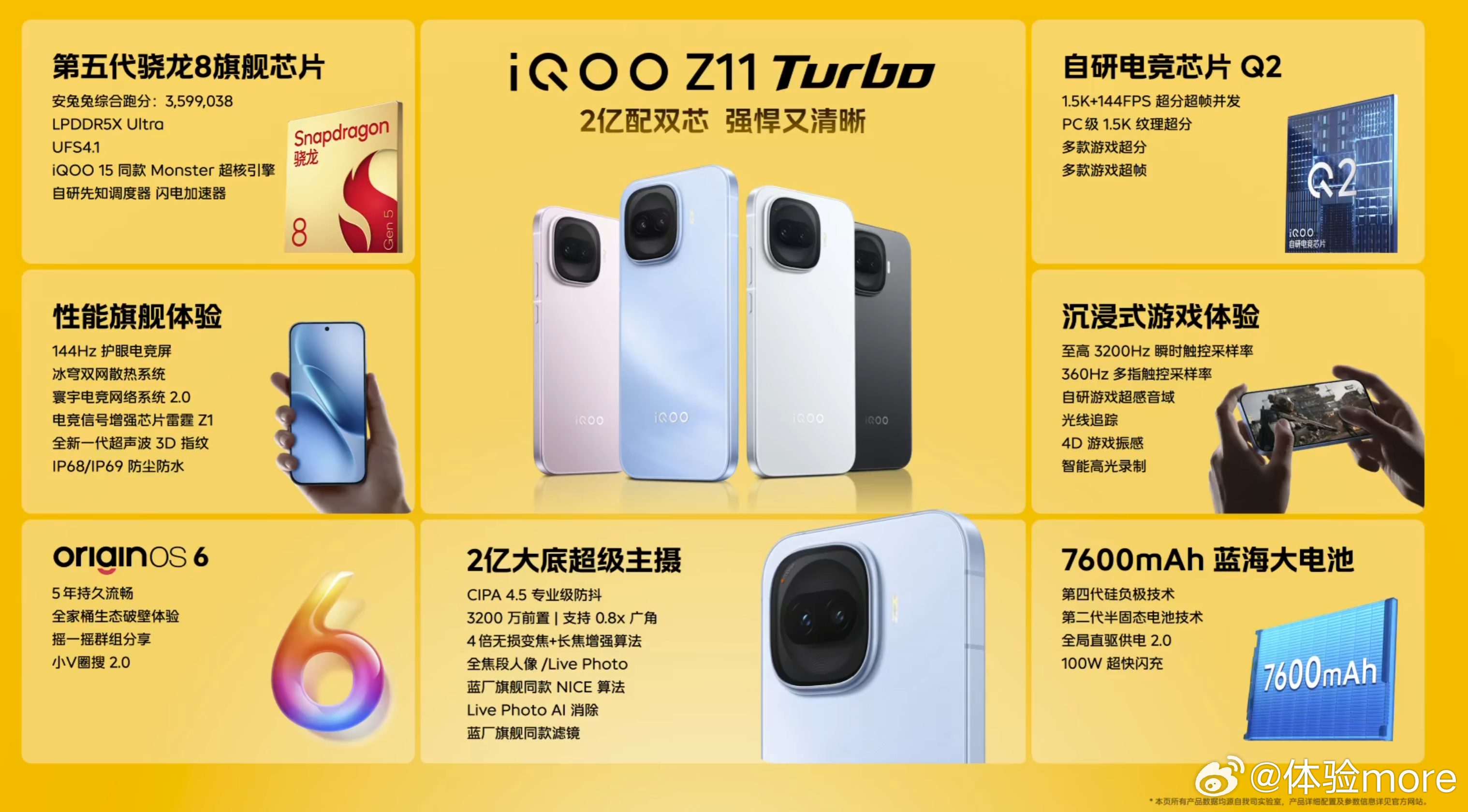iQOO Z11 Turbo价格出来了:12+256,239916+256,269912+512,289916+512,319916+1TB,3699iQOO Z11 Turbo部分规格:骁龙8 Gen5+LPDDR5X Ultra+UFS4.1,6.59英寸1.5K 144Hz LTPS直屏,100W+7600mAh,前置32MP,后置200MP HP5 1/1.56 f/1.88 OIS+8MP,金属中框+玻璃后盖,自研电竞芯片Q2,信号增强芯片雷霆Z1,3D超声波指纹,IP68/69,轻薄至7.9mm/202g。iQOO Z11 Turbo