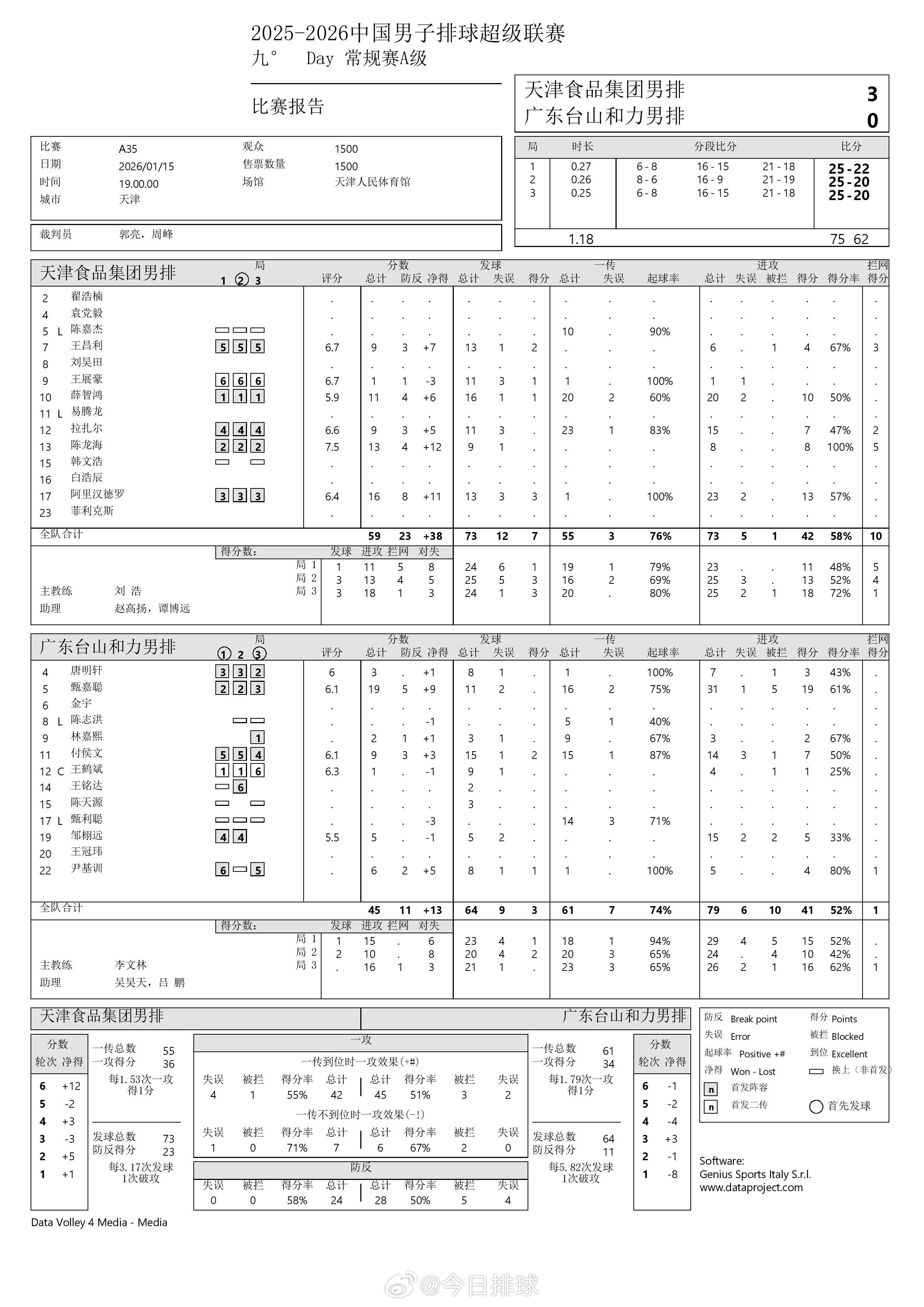【中国男排超级联赛 天津3-0广东得分统计】15日晚,A级常规赛第9轮,天津食品集团在主场以3-0(25-22, 25-20, 25-20)零封广东台山和力,收获第五胜。阿里汉德罗16分,陈龙海13分(拦5),薛智鸿11分,王昌利、拉扎尔各9分;甄嘉聪19分,付候文9分,尹基训6分,邹栩远5分。