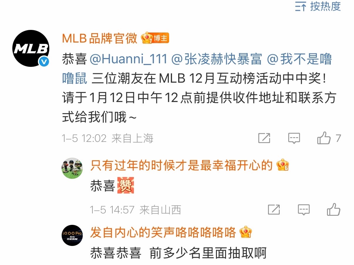 以为中奖羽绒服 没想到是挂件MLB回应抽奖中羽绒服结果收到挂件官方没说是羽绒服,只是说惊喜好礼,然后实际是羽绒服挂件,粉丝收到很失望。MLB做的确实不地道,一没说清楚,二确实太抠了