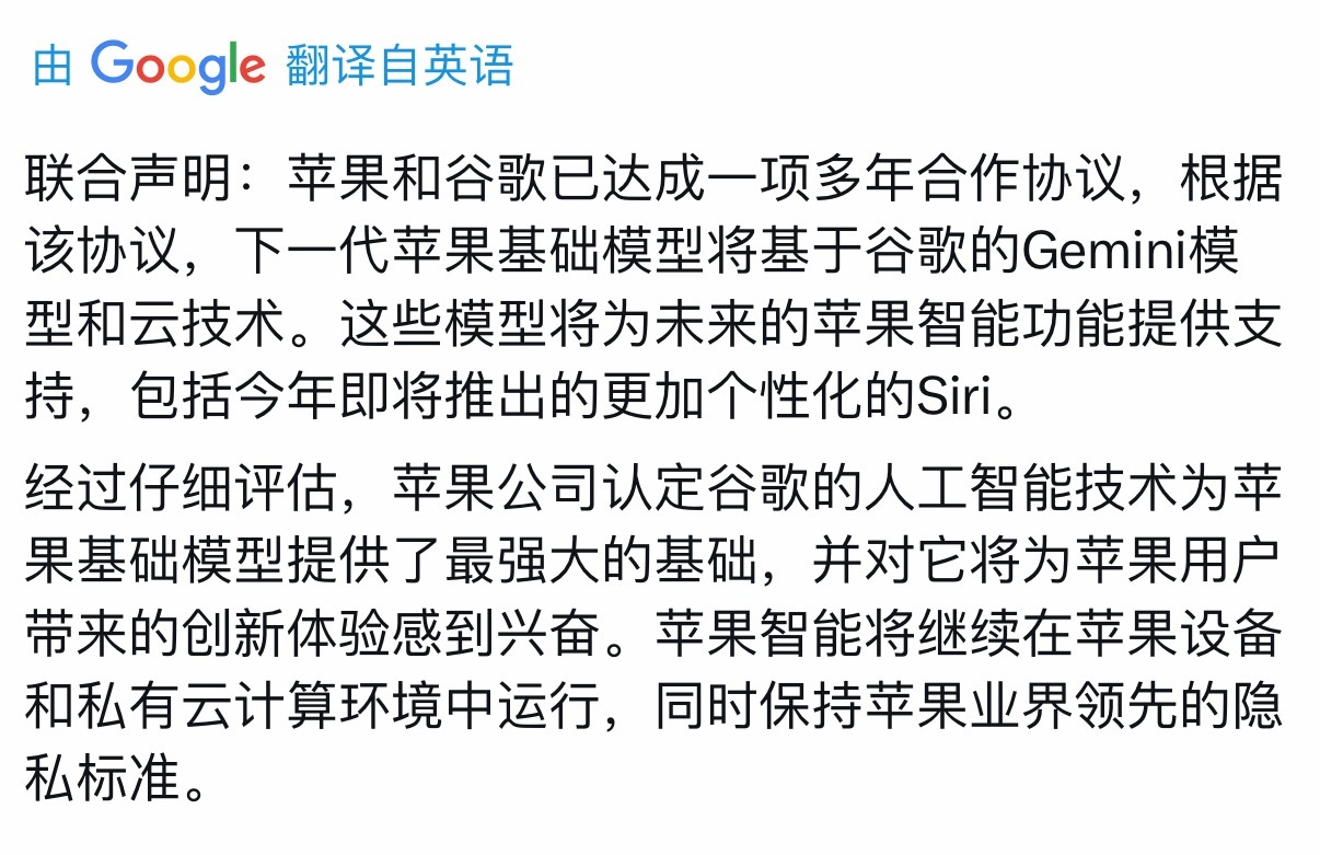 苹果官宣iPhone将搭载最强AI苹果Siri将由谷歌Gemini驱动苹果官宣,下一代苹果基础模型将基于谷歌的Gemini模型和云技术。这些模型将未来的苹果智能功能提供支持,包括今年即将推出的更加个性化的Siri。对此马斯克回应,考虑到谷歌旗下还拥有安卓和Chrome浏览器,这种权力集中似乎有些不合理。不过话说回来,目前主流的AI大模型,Gemini确实比ChatGPT 和Grok好用。