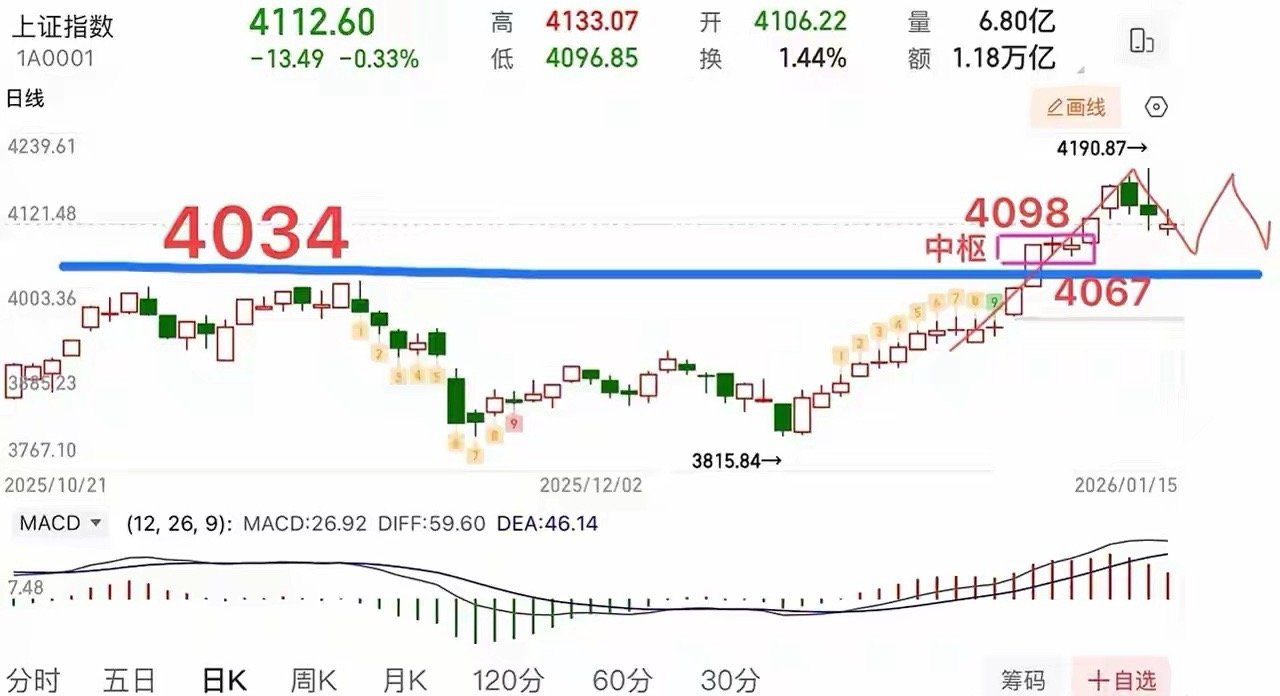 2026.1.15周四收评: 高位股集体跌停!后续怎么看? 打你一棍,给一颗糖!盘后利好来了! 周四大盘小幅震荡整理,收盘十字星,目前来看走势还是比较符合预期,小阴小阳的结构走势,今天比较明显的特征,成交量大幅缩减1万亿,看来“人工降温”还是有很大影响,不过目前市场还需接近3万亿成交,还是相对活跃的,只不过分化而已,高位的按在地板上,低位的轮动补涨。 技术面看,大盘整理问题不大,横向震荡整理为主,5日线逐步靠拢10日线,回踩只要不破4034就都是正常合理的震荡范畴,短线支撑区4098-4067(中枢),4034是不能破的。总之,维持小阴小阳结构的调整方式,就是强的,当作是回踩4034确认来了。 板块方面,AI应用,商业航天调整的比较明显,但市场的主流方向,短期来看不会轻易改变,AI应用,短线确实涨幅过快了,需要降温处理,但还是可以继续跟踪,资金介入的还是比较深的,周线级别缺口,短期内也很难被回补,耐心等回调即可! 打你一闷棍,发你一颗糖,盘后利好来了! 央行:下调各类结构性货币政策工具利率0.25个百分点。不过短期对指数也不要有太大预期,走势一步步跟踪。 个人观点,仅供参考!不作为投资建议!