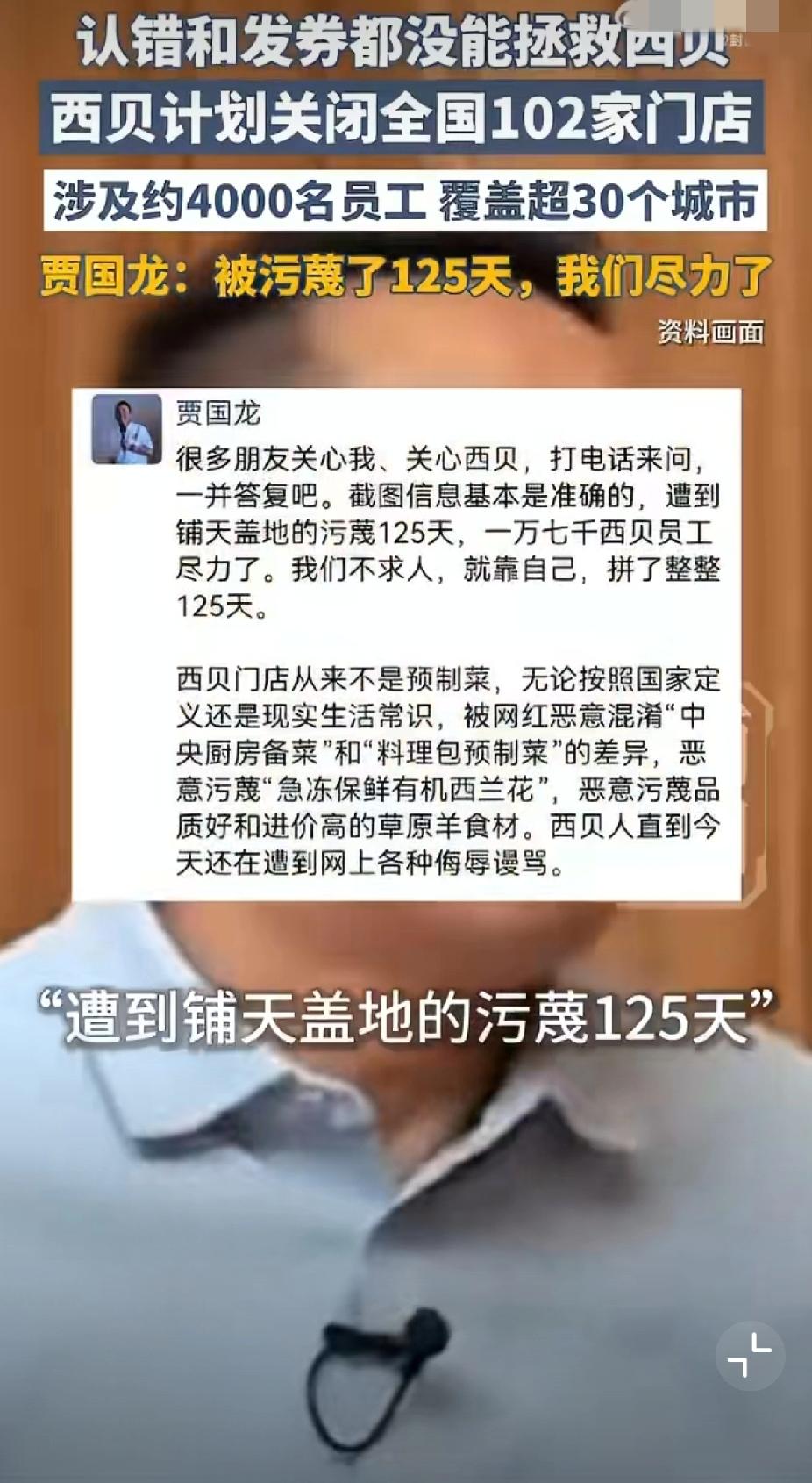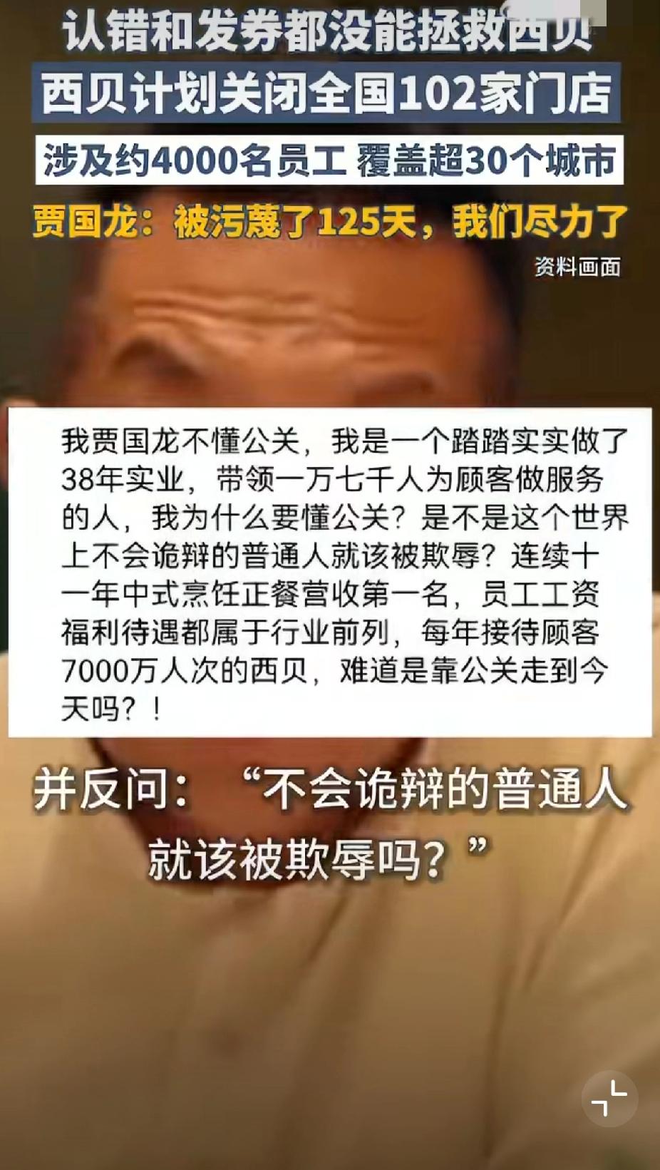 西贝闭店102家!贾国龙硬刚125天不甩锅,这波操作太圈粉 最近餐饮圈大瓜炸了!西贝要一次性闭店102家,占总门店的30%,消息一出全网哗然,网友齐刷刷冲到罗永浩评论区喊他回应——毕竟去年那波“预制菜之争”还没凉透呢 ! 1月15日,贾国龙在朋友圈实锤消息,一句话戳中无数打工人:“遭铺天盖地污蔑125天,一万七千员工拼尽全力,不求人就靠自己” 。要知道这125天里,西贝一边被质疑“预制菜”,一边扛着实体餐饮的压力,贾国龙甚至坦言自己连续40天靠安眠药入睡,58岁还第一次知道“老登”这种网暴用词 。 但闭店声明里的细节,却让人忍不住点赞:离职员工工资一分不差,顾客储值卡想退就退,接了年夜饭的门店哪怕亏本,也要履约完再关门。对比那些卷钱跑路的商家,这波“硬气又有良心”的操作,难怪网友说“这才是企业家该有的样子”! 其实关于预制菜争议,贾国龙早就反思过不该硬刚,还赶紧调整:鸡汤现熬、饺子现包、羊肉串现穿,40多道菜品降价20%,客单价降到75元左右 。他反复强调西贝是中央厨房备菜,不是料理包预制菜,还曾开放后厨让大家监督,这份较真劲儿挺难得 。 实体餐饮这两年是真难,闭店潮一波接一波,但西贝“关店不甩锅、负责到底”的态度,比任何公关都管用。有人说该罗永浩回应,也有人心疼西贝的坚守,你觉得预制菜和中央厨房备菜该区别看待吗?你吃过西贝的现制菜品吗?评论区聊聊你的看法,看看谁的观点更接地气! 西贝闭店102家 贾国龙回应预制菜争议 实体餐饮太难了