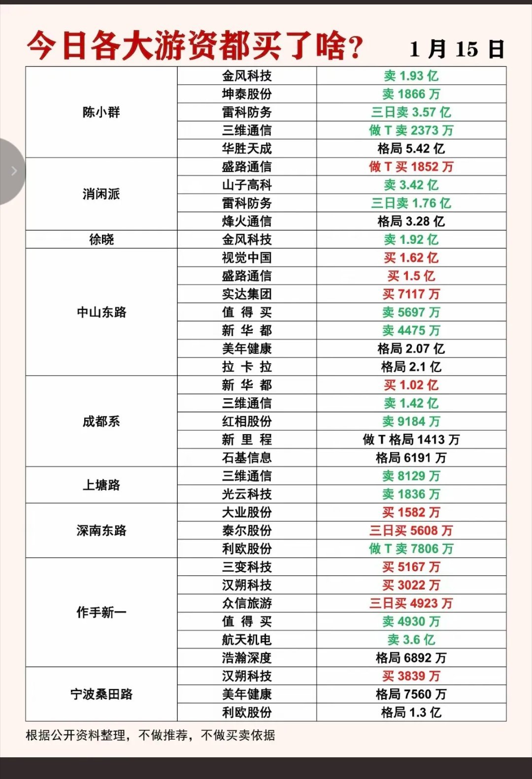 1.15周四 看看游资大佬们都买了啥?!游资抢筹龙虎榜!陈小群 买入 华胜天成 卖出 坤泰股份七彩化学,领湃科技,汉朔科技获多家游资共同抢筹买入。游资票人气热度值高,成交活跃,换手充分。