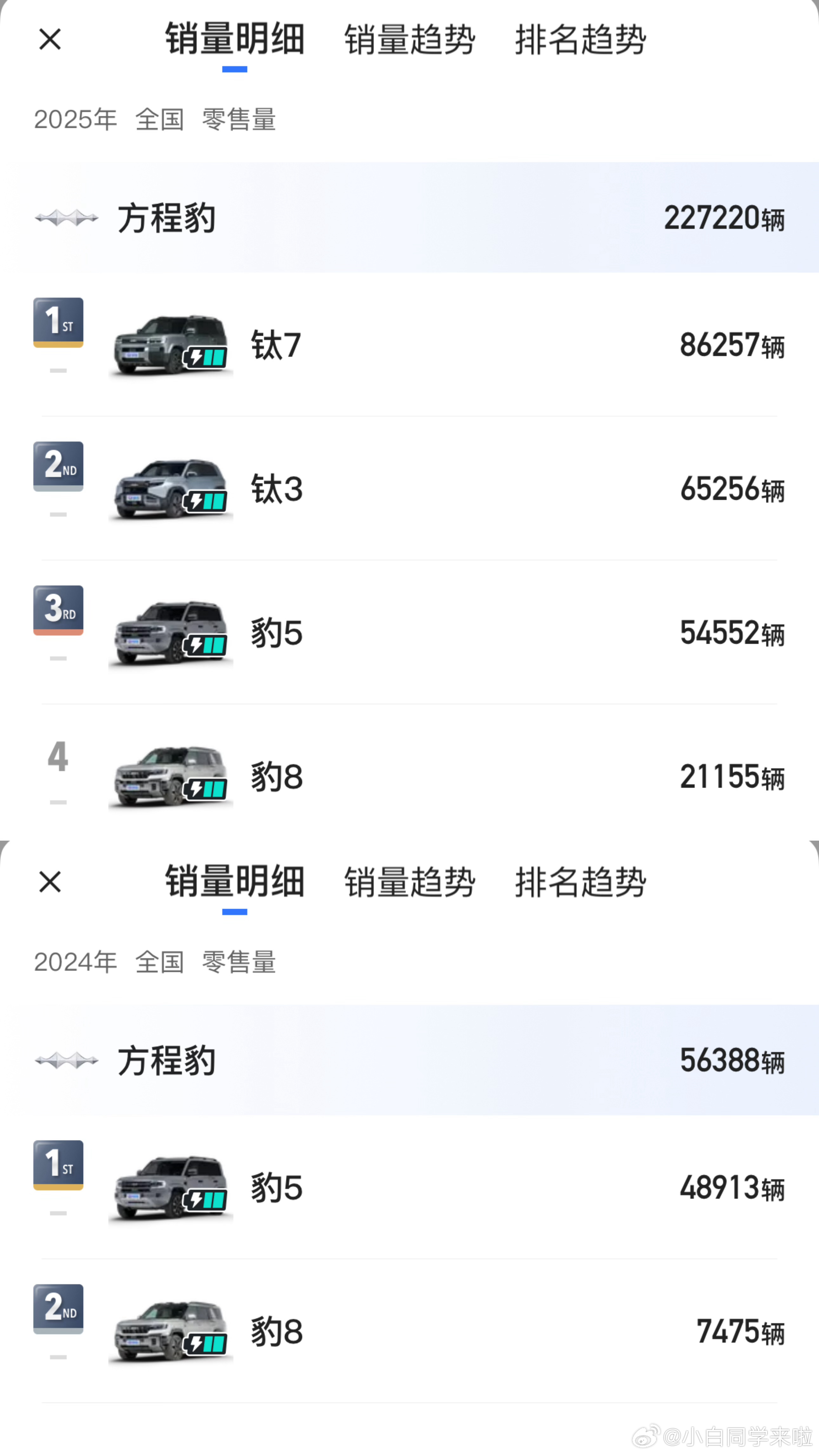 方程豹品牌已经达成 30 万辆成绩了,看了下 2024 年和 2025 年的成绩。2024 年是 5.6 万台,2025 年就来到了 22.7 万台,主要功臣就是钛 7 和钛 3。这样看方程豹调整能力也是很强的,而且今年还会有轿车。新能源汽车大v聊车