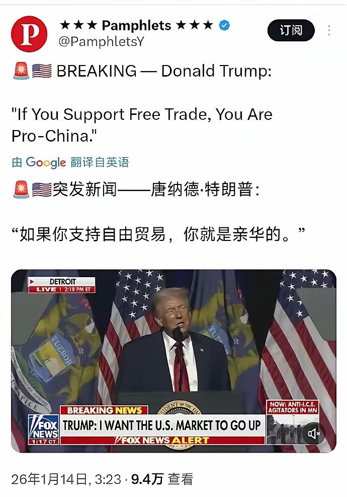 救命!特朗普这言论真的颠覆认知,居然说支持自由贸易就是亲华?魔幻到我以为自己看错了! 谁没印象啊,以前美国把自由贸易当金字招牌,天天举着到处标榜自己是全球旗手,逮着各国就说教,咱中国更是常年被他们拿这事找茬施压,双标的嘴脸早看腻了。 结果现在倒好,自己把这面旗扔地上踩不说,还反手把自由贸易和中国硬绑在一起抹黑,这翻脸速度比翻书还快,评论区网友都炸了,全在吐槽:美国这是彻底摆烂,不讲半点道理了! 说实话我真觉得可笑,这哪是什么理念分歧,本质就是美国觉得在自由贸易里赚不到独占的超额好处了,才搞这出舆论绑架,想拉拢美西方那群不想开放的保守势力,拿中国当靶子罢了。 但明白人真的太多了,刷到好多网友留言:小到街边外贸小店,大到各国经济发展,谁离得开自由贸易?老百姓要实惠商品,企业要海外市场,这是实打实的民生刚需,不是他一句话就能抹黑的。 这种为了一己私利,就随意扭曲概念、制造对立的操作,说到底就是逆着全球大势来,最后只能是竹篮打水一场空,纯属徒劳!