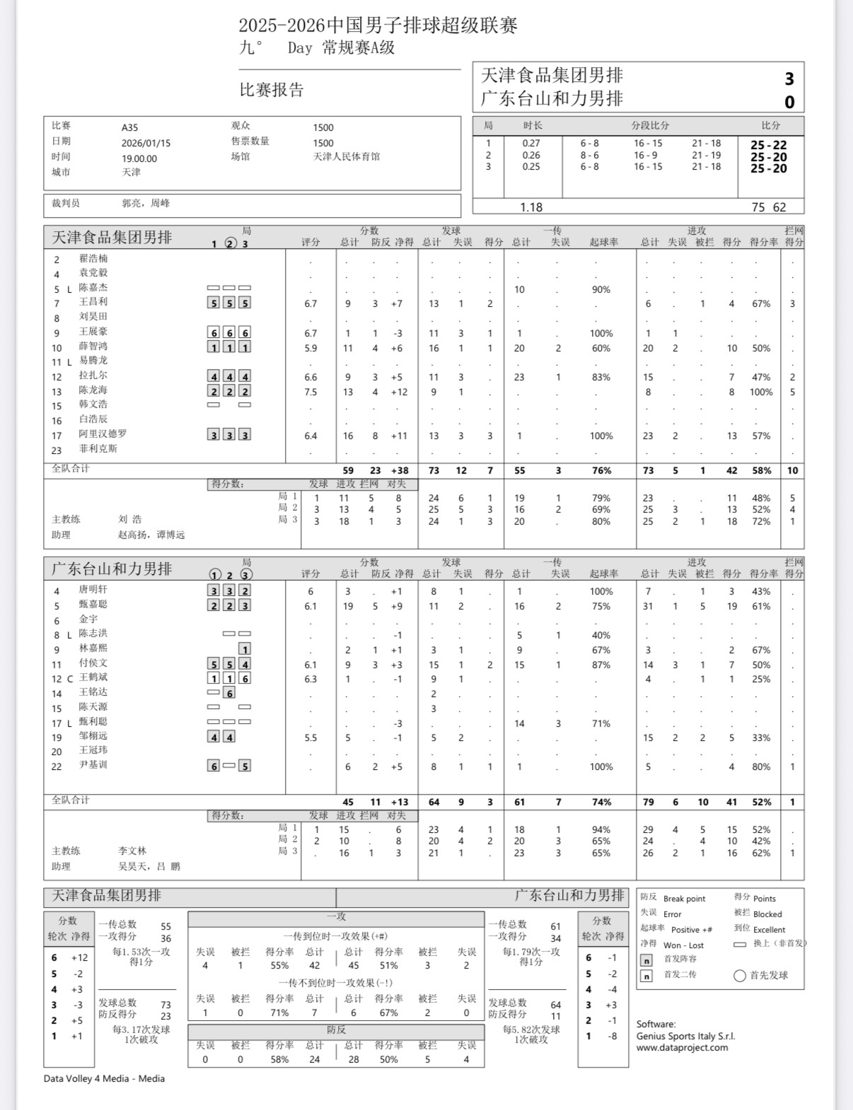 2025-2026中国男排超级联赛 男排联赛第九轮:广东男排客场0-3不敌天津男排(22-25,20-25,20-25)。甄嘉聪19分(31扣19中1失误5被拦)陈龙海13分(8扣8中,5拦)