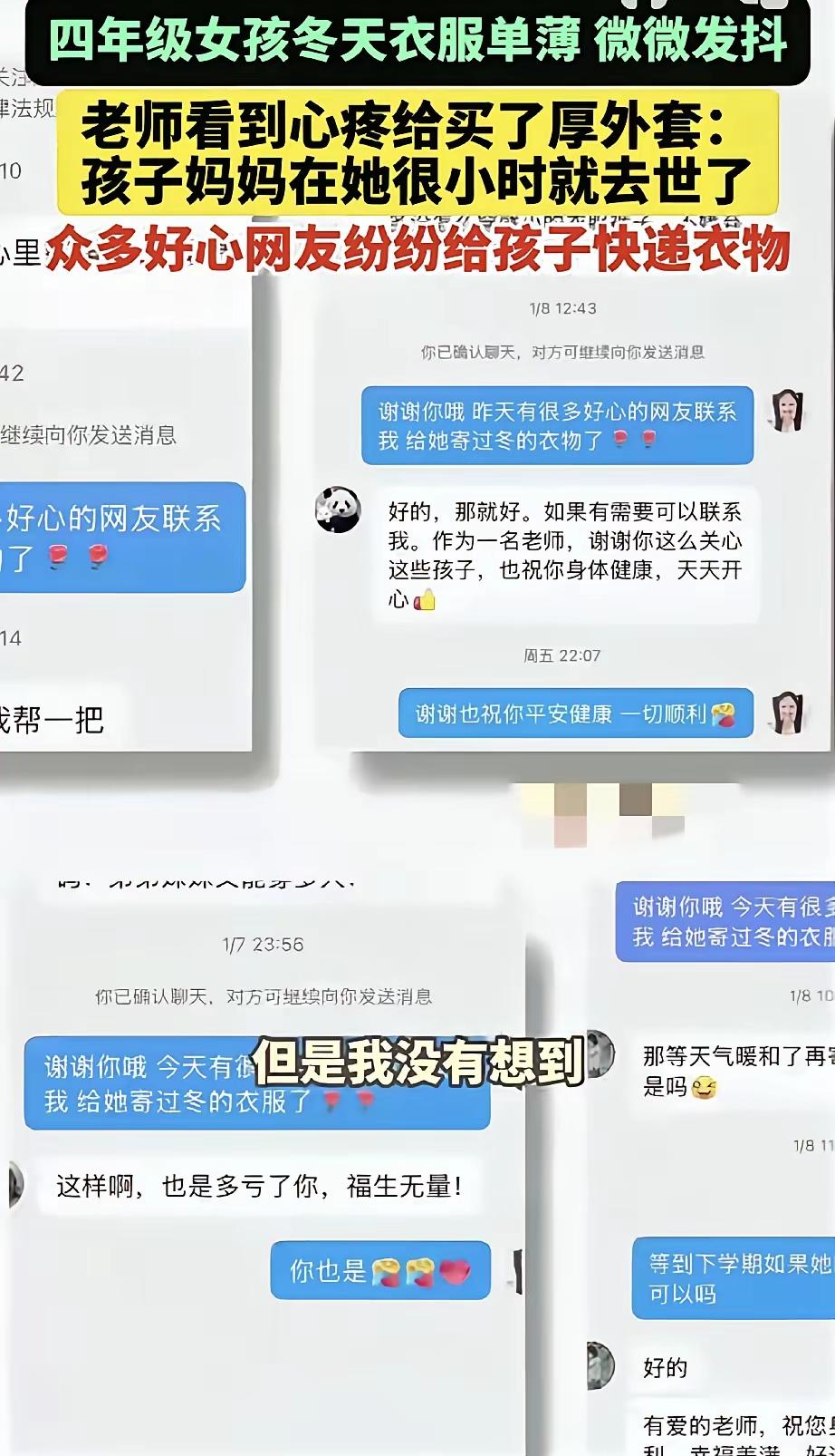 云南小学英语老师见女生雪天衣着单薄,暖心举动藏着教育的温度。 万万没有想到,云南一小学英语老师,因看见她教的四年级女生,在下雪天还衣着单薄的上学,女生在食堂吃饭时,更是被冻得微微发抖。 这位英语老师叫李雪,今年28岁,在云南昭通这所乡村小学任教已经五年,班里的孩子大多是留守儿童,父母常年在外打工,跟着爷爷奶奶一起生活,家境普遍不算富裕。那天是当地入冬后的第一场雪,山区的气温骤降到零下,学校里的孩子大多穿上了厚棉袄、棉鞋,唯独班里的女生小诺,依旧穿着单薄的校服外套,里面只套了一件薄毛衣,脖子上也没有围巾,双手揣在兜里,缩着肩膀走进教室。 李老师第一眼看到小诺,心里就揪了一下。她知道小诺的情况,小诺的父母在浙江打工,一年才回来一次,奶奶年纪大了,手脚不便,家里的棉衣还是前年亲戚送来的,今年已经小了穿不上,奶奶想着凑活过个冬天,等开春父母回来再买新的,却没料到这场雪来得这么早,气温降得这么厉害。 上午的课上完,李老师去食堂巡查,远远就看到小诺坐在餐桌前,手里端着热粥,却因为手冻得僵硬,勺子都握不稳,身子还在微微发抖,连吃饭的速度都慢了很多。李老师走到小诺身边,摸了摸她的手,冰得像块石头,再看她的耳朵,也冻得通红,李老师的眼眶一下子就红了。 她没有当着同学的面问小诺原因,只是轻轻把自己的围巾解下来,围在小诺的脖子上,又把自己办公室的暖手宝拿出来,充好电递给小诺,让她捂着手吃饭。小诺抬头看着李老师,眼里含着泪,小声说了句“谢谢老师”,声音软糯,却让李老师心里越发不是滋味。 中午午休时,李老师没有休息,而是打开手机,翻出自己的购物软件,先是给小诺选了一件加厚的棉袄,一双加绒的棉鞋,还有围巾、手套和保暖内衣,选的都是尺码合适、材质柔软的款式,付款时没有丝毫犹豫。她想着小诺可能还有其他同学也面临同样的情况,又去班里看了看,发现还有三个孩子也穿着单薄,便一并给这三个孩子也买了保暖的衣物。 山区的快递配送慢,李老师等了四天,衣物才送到学校。她趁着课间,把衣物分别送到四个孩子手里,孩子们拿到新衣服时,脸上露出了腼腆又开心的笑容,当场就想试穿。小诺穿上新棉袄后,特意跑到李老师面前,转了一圈,跟李老师说“老师,这件衣服好暖和”,那一刻,李老师觉得所有的付出都值得。 这件事李老师没有跟任何人提起,直到学校的保安师傅看到她帮孩子搬快递,问起缘由,事情才在学校里传开。校长知道后,特意在教职工大会上表扬了李老师,还说要号召全校老师向她学习。可李老师却说,自己只是做了一件微不足道的小事,作为老师,看到孩子受冻,不可能置之不理。 李老师任教的这五年里,对班里的留守儿童格外上心。有的孩子作业不会写,她会利用课后时间耐心辅导;有的孩子生病了,她会第一时间送孩子去卫生室,垫付医药费;有的孩子想念父母,她会拿出自己的手机,让孩子和父母视频通话。她常说,乡村的孩子更需要关爱,作为老师,不仅要教给他们知识,更要给他们温暖。 小诺的父母得知这件事后,特意给李老师打了电话,在电话里连连道谢,说要把买衣服的钱转给李老师,李老师却拒绝了。她跟小诺的父母说,孩子在学校里,她会多照顾,让他们在外打工放心,还嘱咐他们在外也要注意身体。 教育从来都不只是知识的传递,更是爱的传递。乡村教师扎根在基层,用自己的微薄之力,温暖着一个个孩子的童年,他们就像冬日里的暖阳,照亮了孩子前行的路。 各位读者你们怎么看?欢迎在评论区讨论。