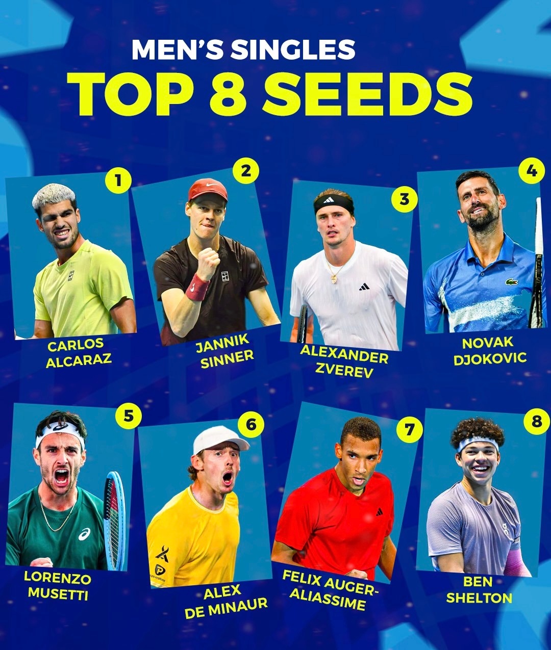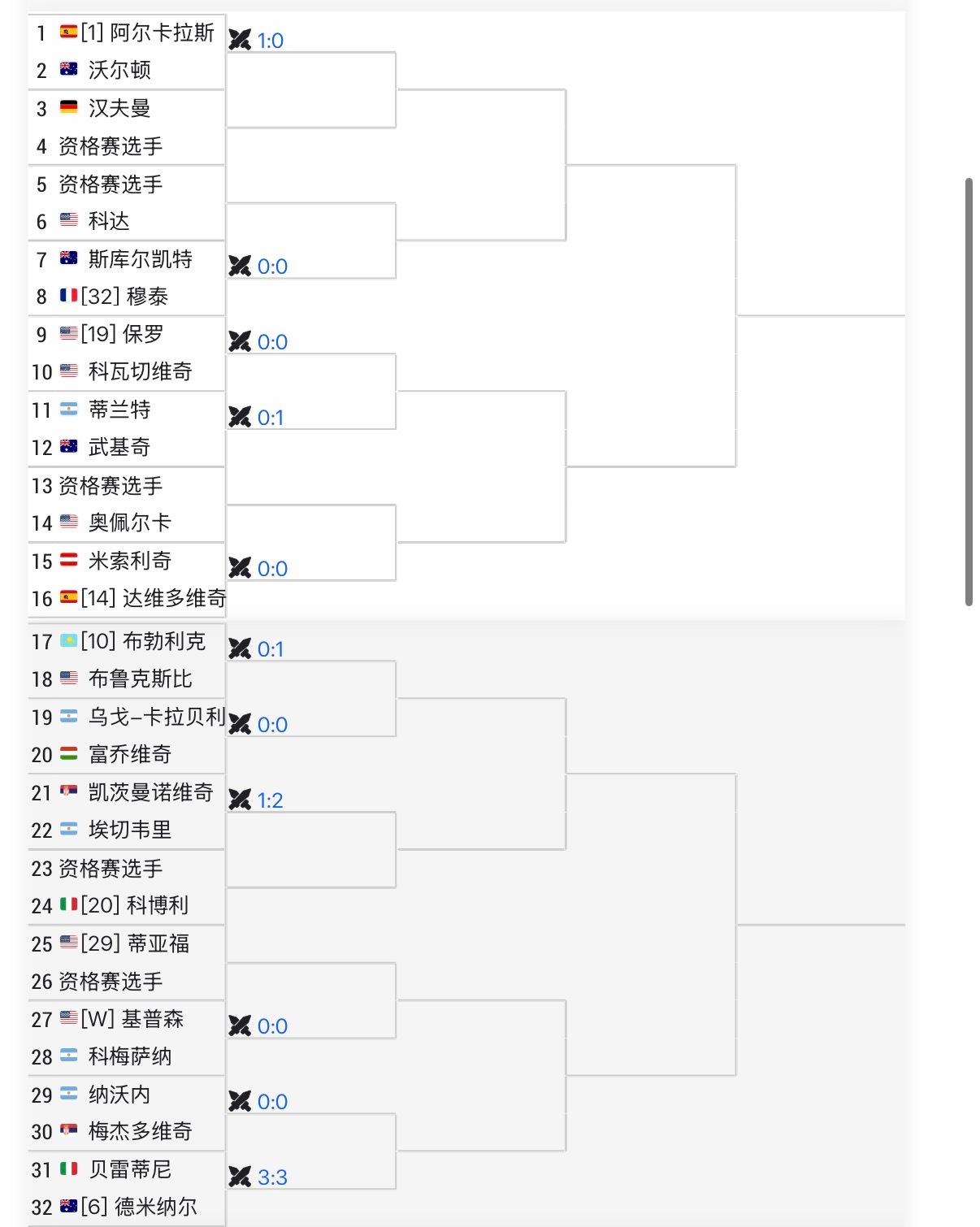 澳网男单完整签表大种子对位:阿尔卡拉斯 - 德米纳尔兹维列夫 - 阿利亚西姆穆塞蒂 - 德约科维奇谢尔顿 - 辛纳其实关键就看德约科维奇分在上半区还是下半区去年德约在阿卡那个区,今年在辛纳这个区……今年冠军会是?🇨🇳布云朝克特vs沙波瓦洛夫🇨🇳商竣程vs阿古特🇨🇳张之臻vs F·塞伦多洛澳网抽签仪式这很澳网澳网2026