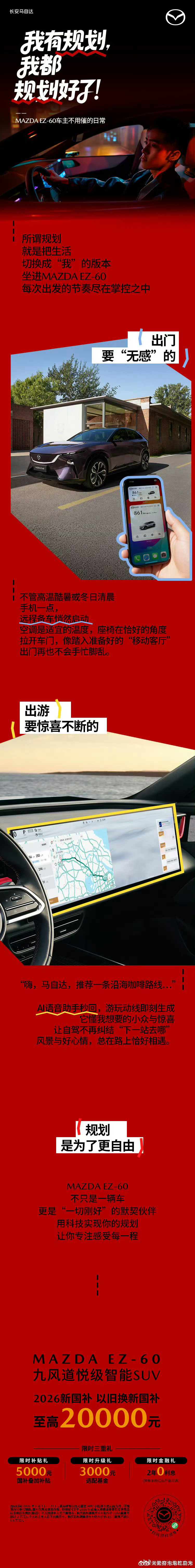 出门,不需等待 远程备车,四季皆宜的温度刚好❀ AI规划路线😎,风景与惊喜,总在路上相遇…… MAZDA EZ-60,不只是一辆车,更是“一切刚好”的默契🙌 用科技实现你的规划,你只管出发,生活自有答案 到店试驾同款👉,限时福利也已经规划好了哦~