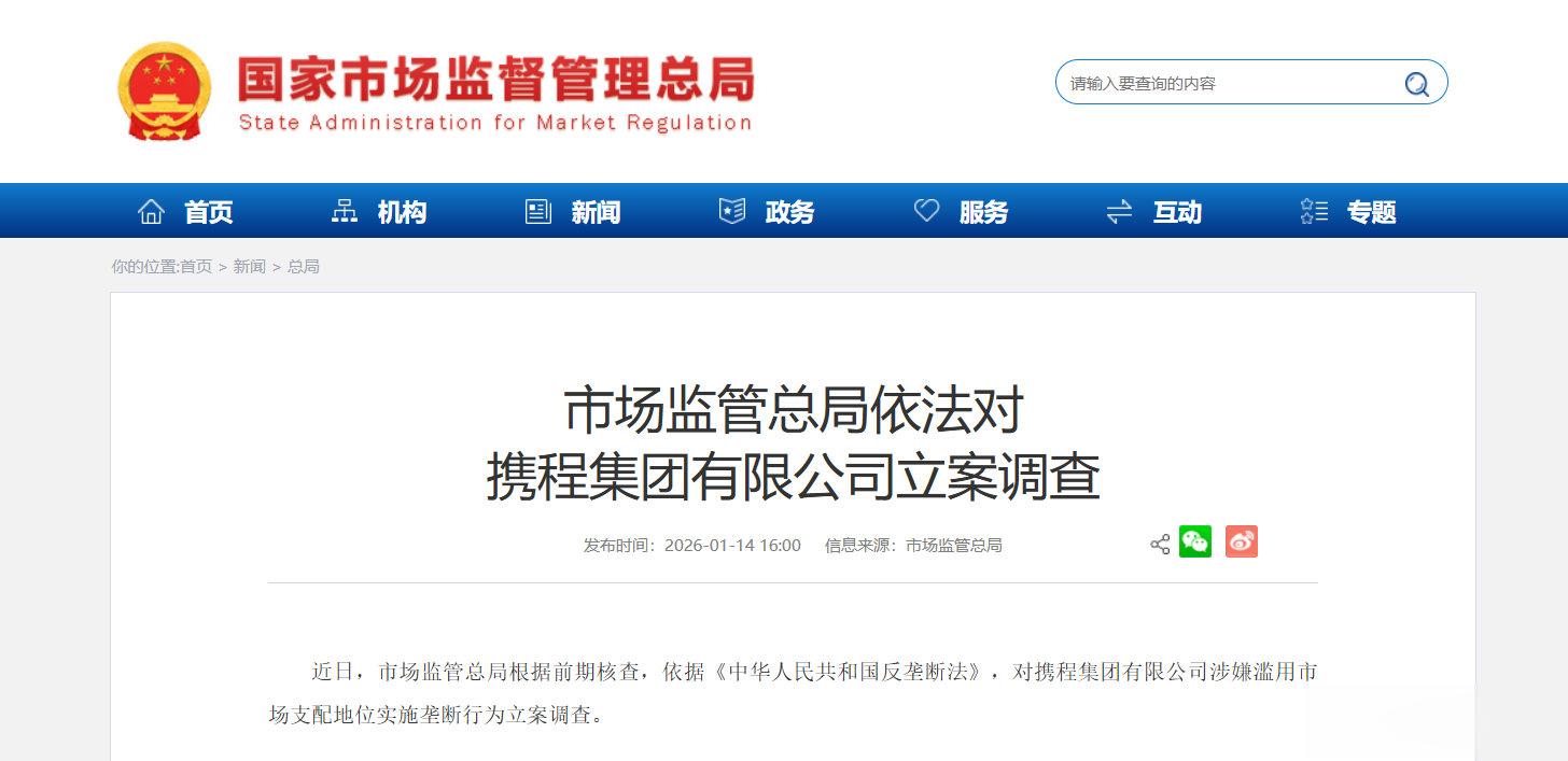 短短两天后,1月14日,国家市场监管总局宣布依据《中华人民共和国反垄断法》,对携程集团有限公司涉嫌滥用市场支配地位实施垄断行为立案调查。