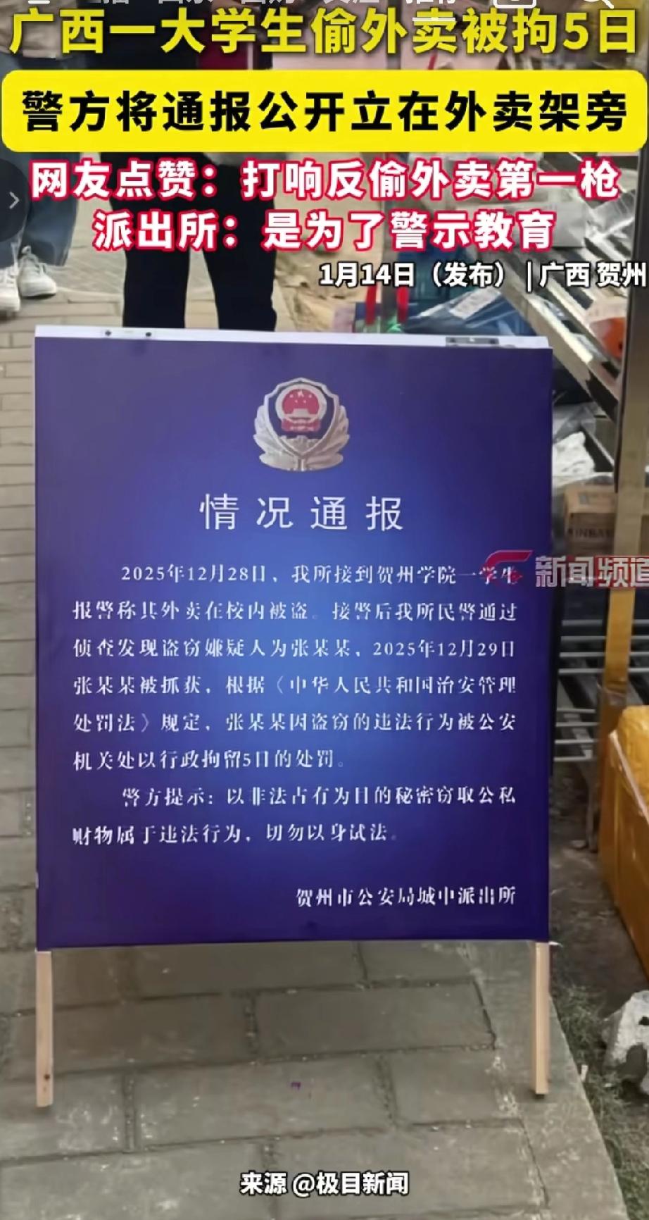 近日广西学院一名大学生偷外卖被处罚该大学生因偷外卖被行政拘留5日,警方将情况通报做成展示牌,立在外卖架旁。派出所表示此举是为了警示教育,网友则点赞称这是“打响反偷外卖第一枪枪。(来源于@广西新闻频道 )