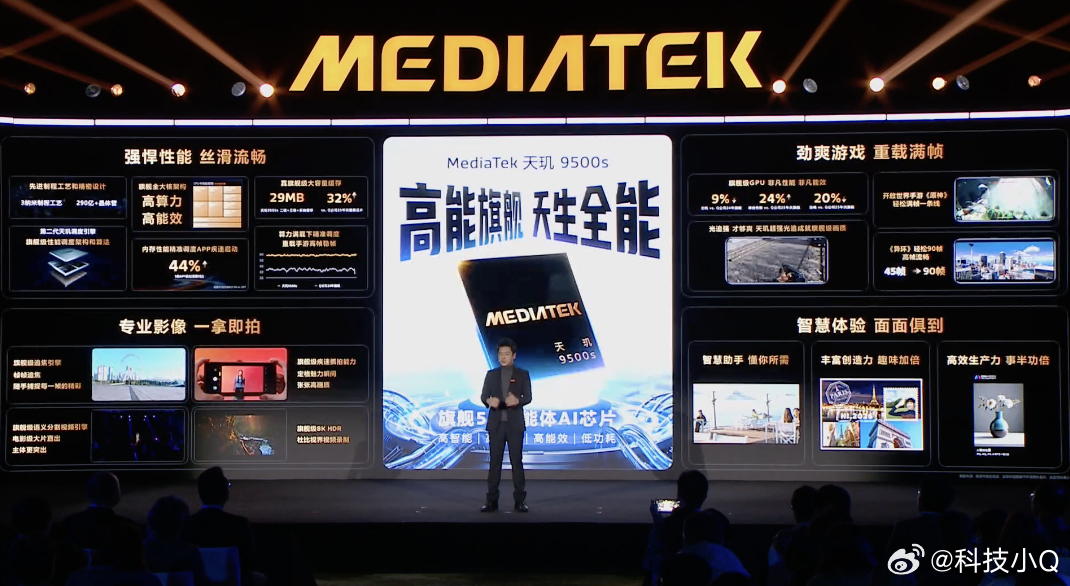 天玑 9500是今年各大旗舰机都采用的芯片今天天玑 9500s又来啦!处理器部分:3nm制程和全大核架构,八核CPU包含 1 个主频高达3.73GHz 的 Cortex-X925 超大核,以及 3 个 Cortex-X4 超大核和 4 个 Cortex-A720 大核。大容量高速缓存。游戏玩家关注的GPU部分,全新Immortalis-G925支持光线追踪技术,天玑 OMM 追光引擎能够高效渲染图形,借助天玑星速引擎的自适应技术 3.0(MAGT 3.0)和天玑倍帧技术 3.0(MFRC 3.0),游戏能效再提升!NPU部分,支持端侧 AI 实况照片美化、AI 照片编辑(扩图、抠图、消除),AI 内容摘要(通话、会议和文件)等日常高频功能。影像能力,支持实时 30 帧运动追焦和 8K 全焦段杜比视界 HDR视频录制。