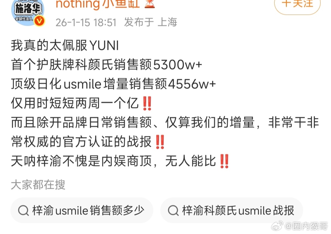 只有你的纯销售额像梓渝那么干不加限定词和乱七八糟的title,才能被叫做商顶噢一个护肤+一个护牙两个品牌半个月仅纯销售额就狂炫9800多w将近一个亿,哎呀不多不多,对人美心善既有才又有财的yuni来说轻轻松松啦!