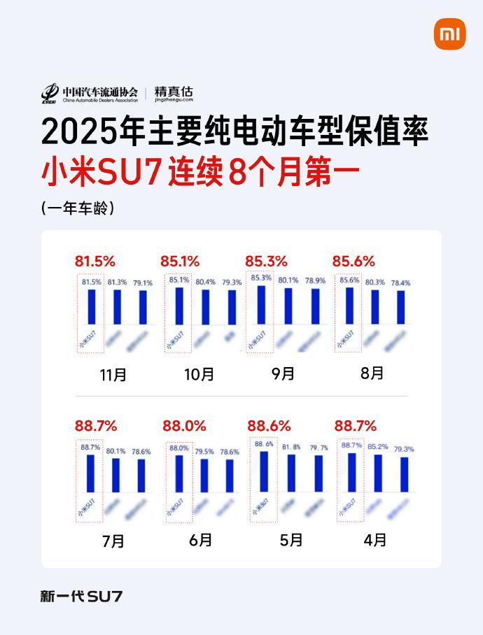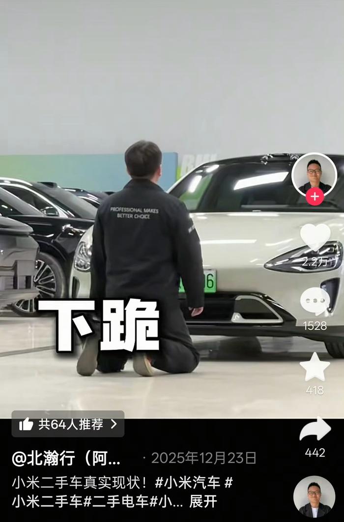 今天小米官方发文,证明在刚刚过去的2025年,小米su7有连续长达八个月是国内纯电车型里最保值的车型。 数据显示,4个月的保值率能达到88.7%,5个月的88.6%,6个月的88.0%,7个月的88.7%,8个月的85.6%,9个月的85.3%,10个月的85.1%,11个月的81.5%,甚至连车龄12个月的都有80.1%的保值率。 该数据与之前网络上常见的二手车商的表述大相径庭,当时大量二手车商发布文字视频表示小米汽车的车价下跌严重(图2、图3),但是却并未做更详细的解释。其实略微了解的就知道这些人其实是在无病呻吟。 这些二手车商之所以演这一出戏,那是因为相比24年的小米su7供不应求,溢价严重,2025年的小米汽车由于产量得到提高,更多的人选择去购买新车而不是买二手车。这导致此前较高的二手车利润荡然无存。这些二手车商哭的并不是小米汽车不值钱了,而是他们没办法再靠倒卖小米汽车来获得暴利了。而如今的小米汽车也依然是二手市场里最为抢手的商品之一。