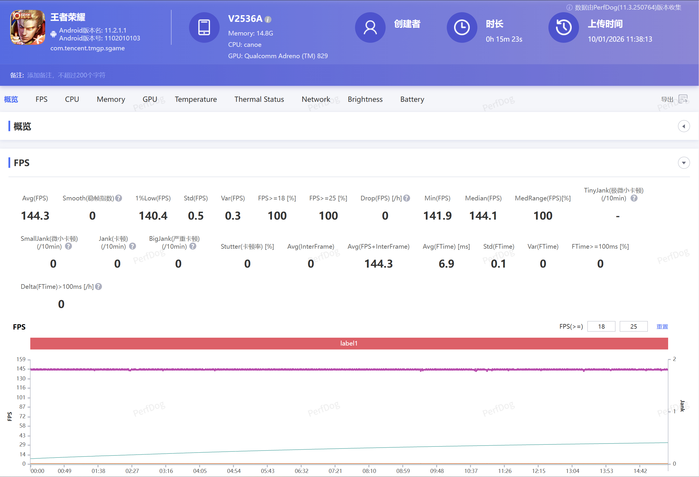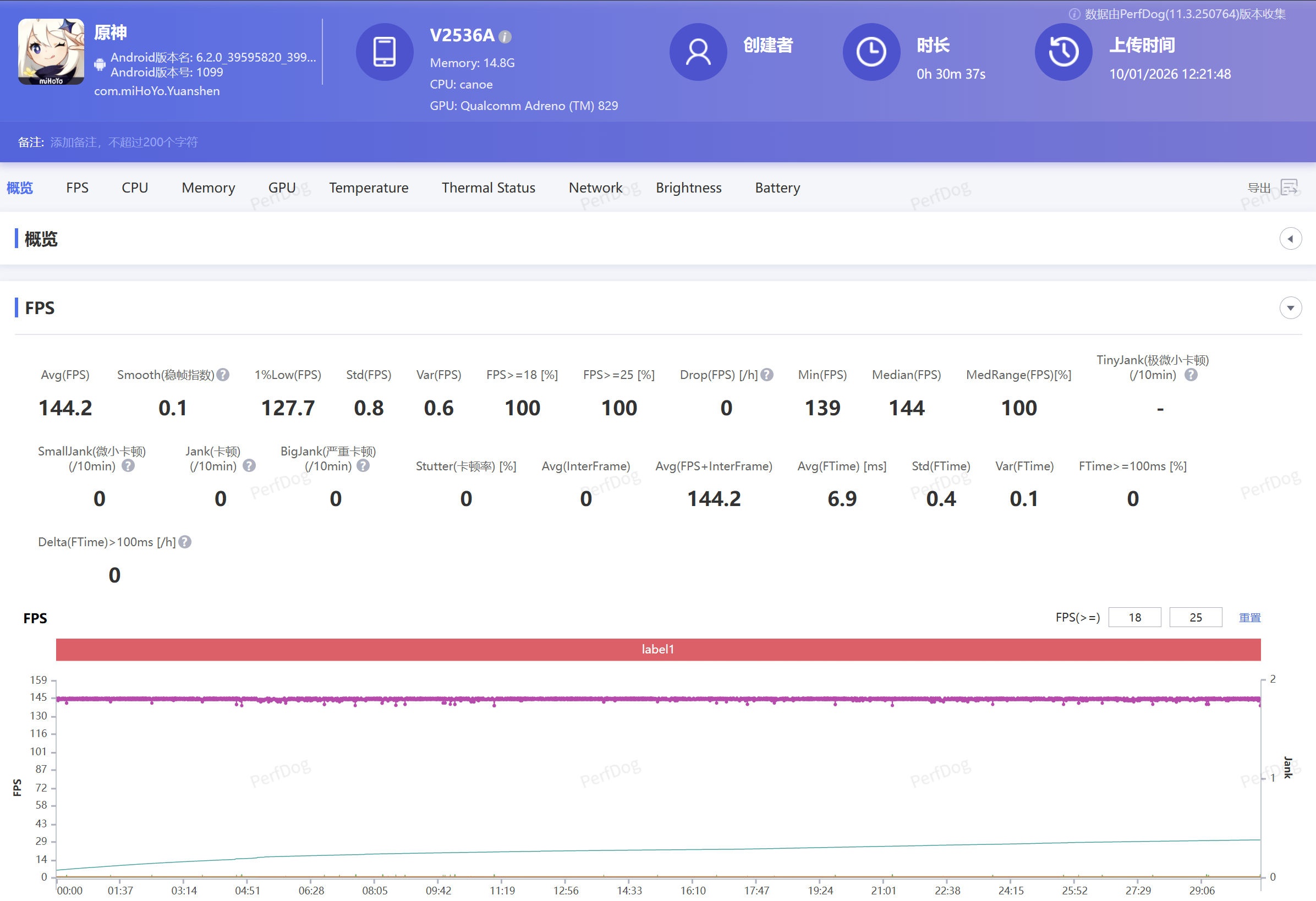 拥有旗舰双芯的iQOO Z11 Turbo,它的游戏性能表现到底如何,路飞专门进行了一下游戏测试,并使用Perfdog软件进行了帧率记录,咱们就来看看它的具体表现。首先是国民手游王者荣耀,开启超级帧率和极致画质模式下,15分钟的一场对局下来,平均帧率达到了144.3帧,1%Low帧更是高达140.4帧,在开始4D游戏振感之后,这个体验真的太棒了。帧率稳,释放技能杀敌的振感反馈更是爽翻天,这才是专业电竞游戏机该有的样子。然后是30分钟的原神,同样开始超帧超高画质模式,平均帧率竟然也高达144.2帧。要知道这可是非常吃性能的原神啊。单就说这个游戏表现,基本上没有对手了吧,太强悍了。不得不说,iQOO对于手机游戏表现的调校,真的堪称顶级了。
