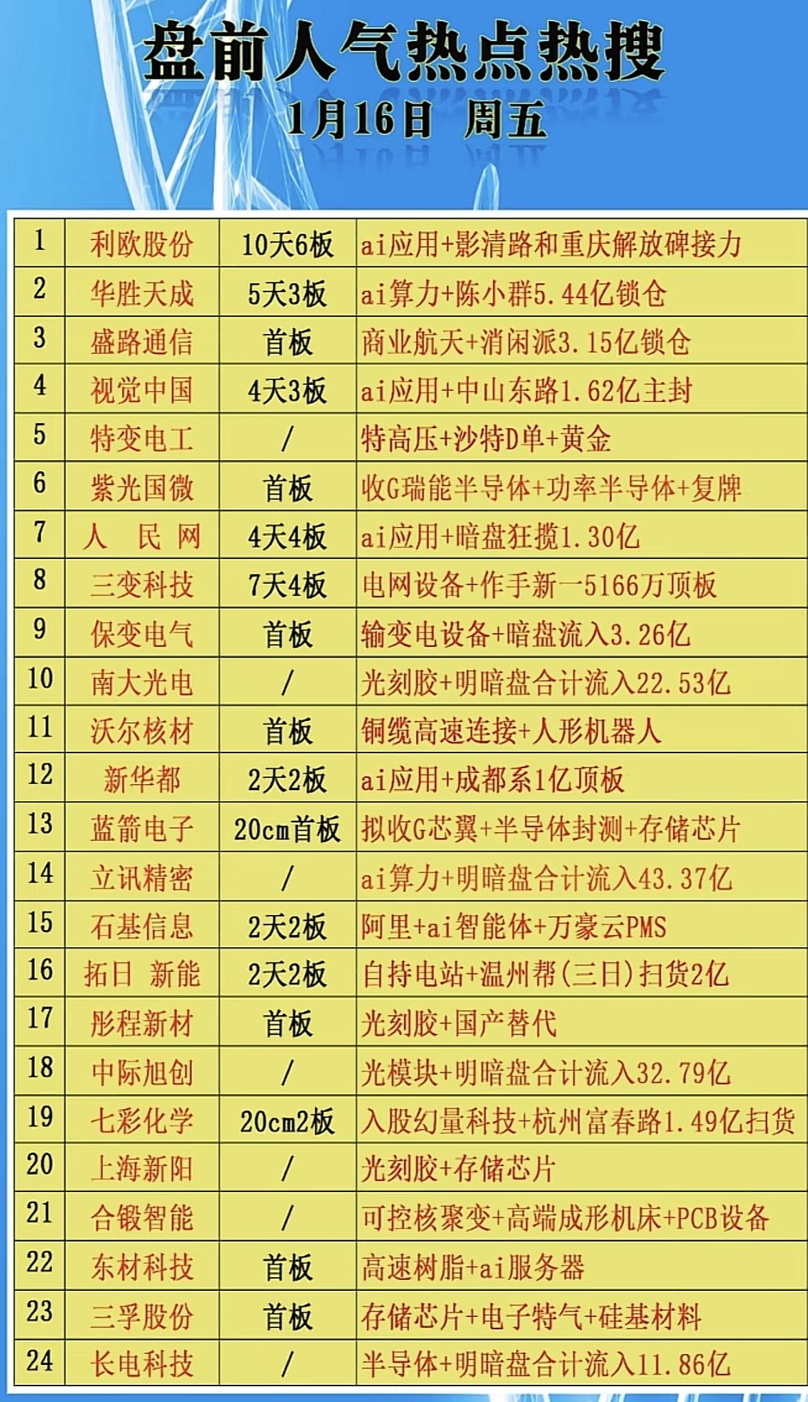 1月16日盘前人气热点热搜,带你掌握最新股市动态! AI概念股爆发,光刻胶、半导体、算力板块领涨,多股连板,资金大幅流入科技赛道。 AI应用与半导体板块强势领涨,光刻胶、算力、商业航天等概念股受资金热捧,市场交投活跃。