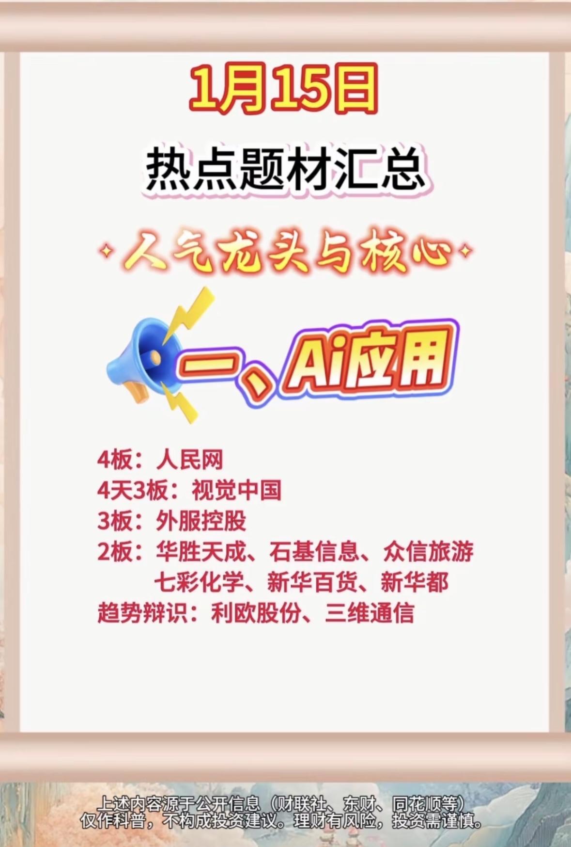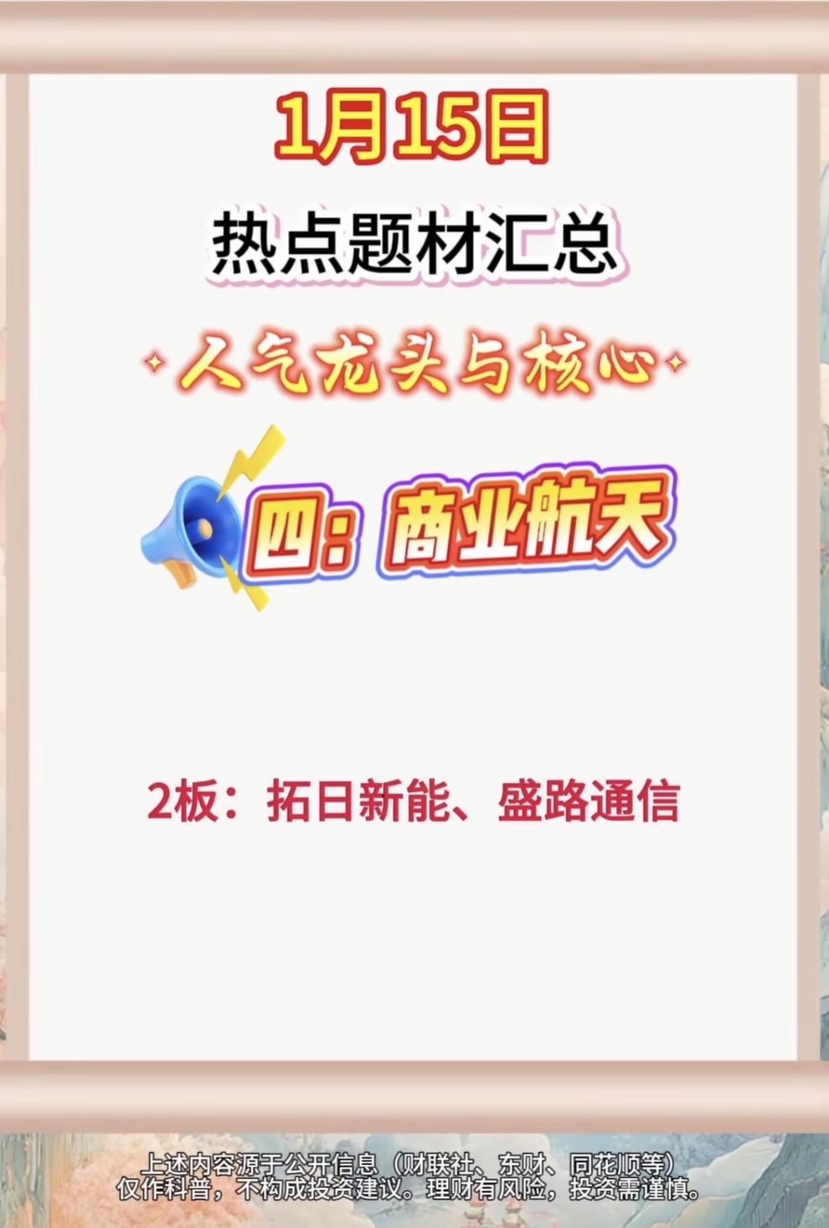 1月15日热点题材汇总:人气龙头与核心,商业航天大爆发! 股市热点轮动,人民网领涨,视觉中国等跟风。题材活跃但需警惕风险,理性投资为上。 股市热点轮动:人民网领涨,视觉中国等跟风。题材股活跃,趋势股受关注。市场有风险,决策需谨慎。
