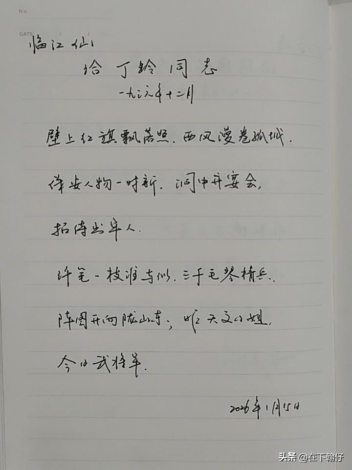 抄书第 1061天(2026年1月15日) 静心✔ 戒浮躁,一笔一划。 今天继续抄《毛泽东诗词集》其一之《临江仙·给丁玲同志》,这是毛泽东赠给著名女作家丁玲同志的一首诗。 这是一首赠友词,《临江仙·给丁玲同志》虽并非最负盛名的上乘之作,却独具特色。此词以叙事诗风格呈现,依循事件发展顺序,用质朴的语言和真挚的情感,如涓涓细流般娓娓道来。自抄诗词 抄诗感悟 抄书打卡 抄抄书 练练字 静静心