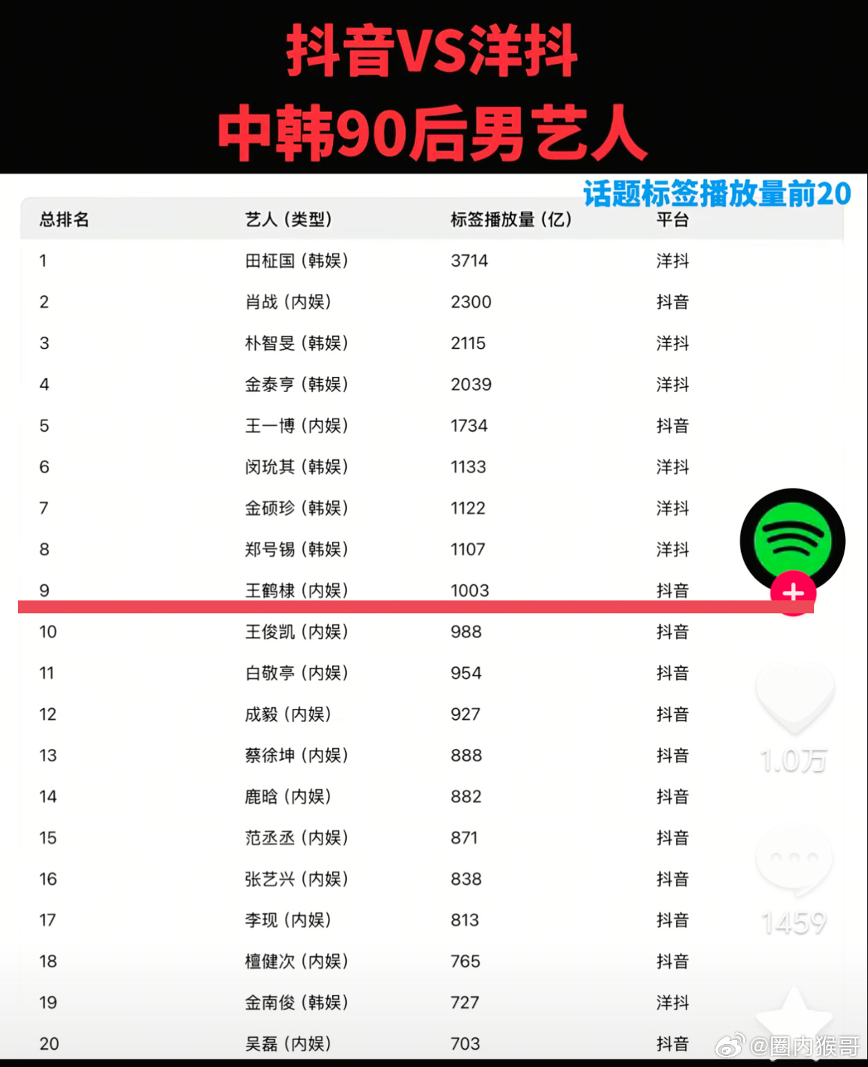 王鹤棣这么厉害!中韩90后那么多男艺人tiktok和抖的播放量对比,他能在竞争那么激烈的情况下进入前十,还是中国男艺人的第三位!好🔥啊!