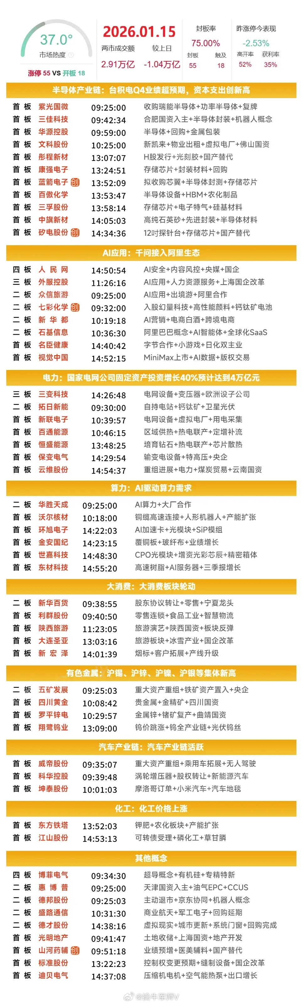 1月15日涨停复盘 | 短线情绪降温,以光刻胶为代表的半导体板块午后爆发,智能电网板块尾盘异动
