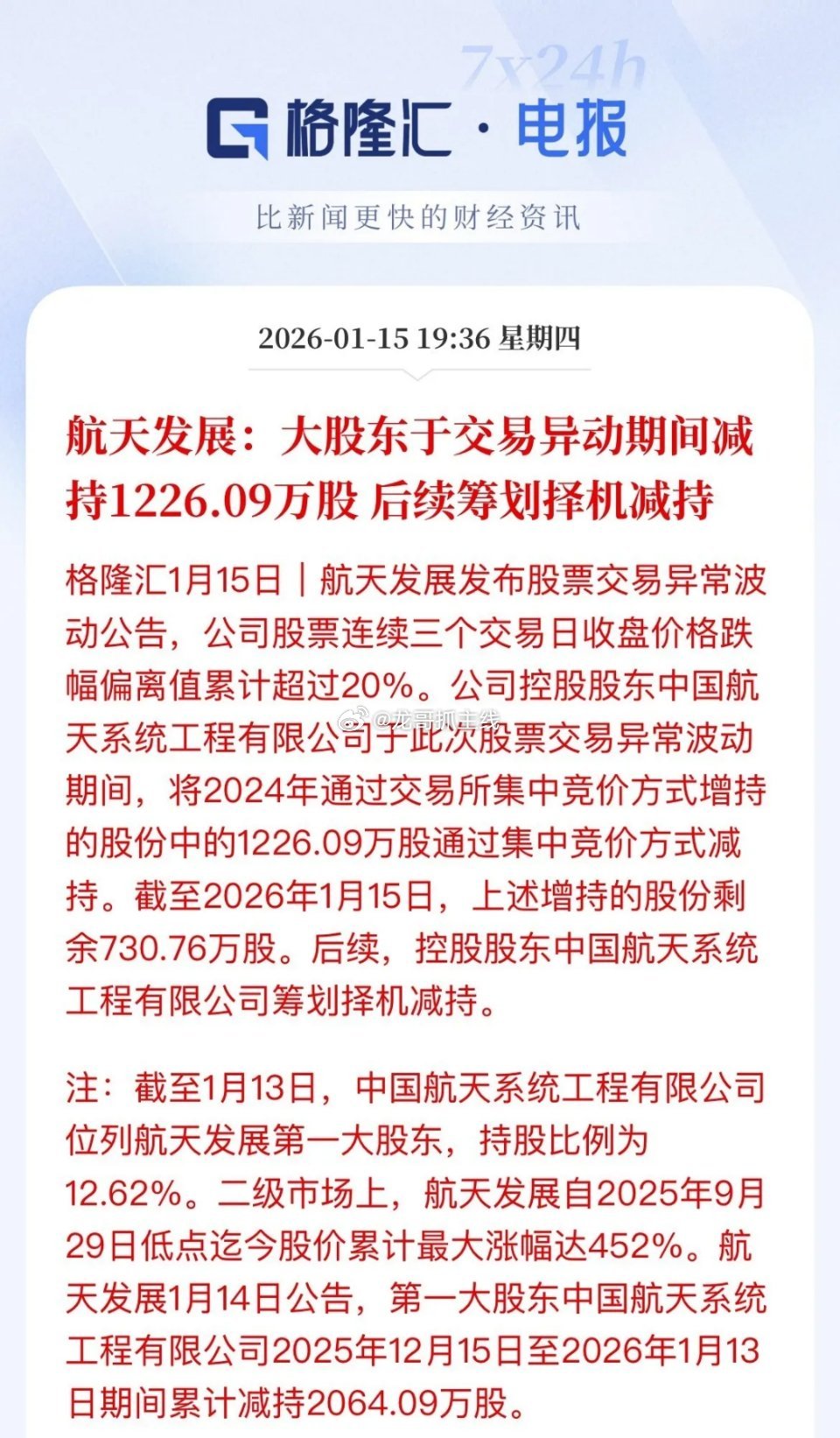 翻4.5倍的航展发布公告减持,屡见不鲜,只要涨的好,基本最终就是这个操作,减持,A股最让人糟心就是:股东减持了航天发展从去年低点到现在也涨幅超450%,股东是2024年进去增持,这一波上来也算是挣的盆满钵满的了,再说人家增持2000万股,现在才减1200万股,当然他也是没想到突然就这么崩了,不然干活早干完了,还有700万股只能等后面了,人家都说后续择机减持。